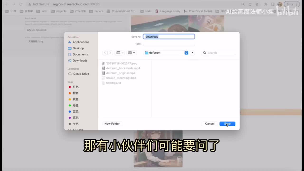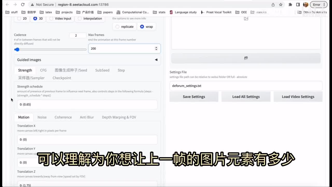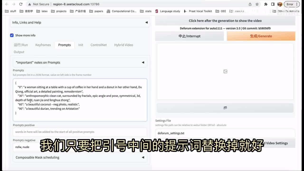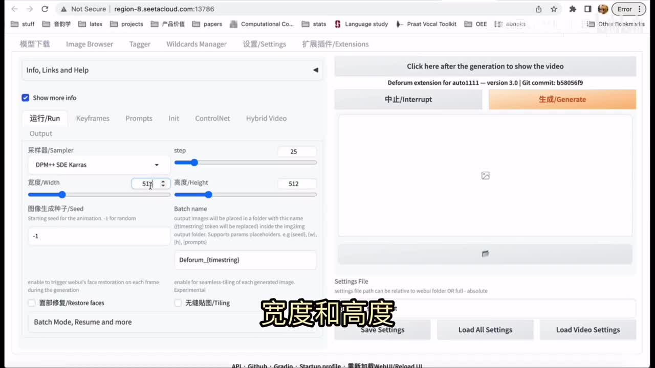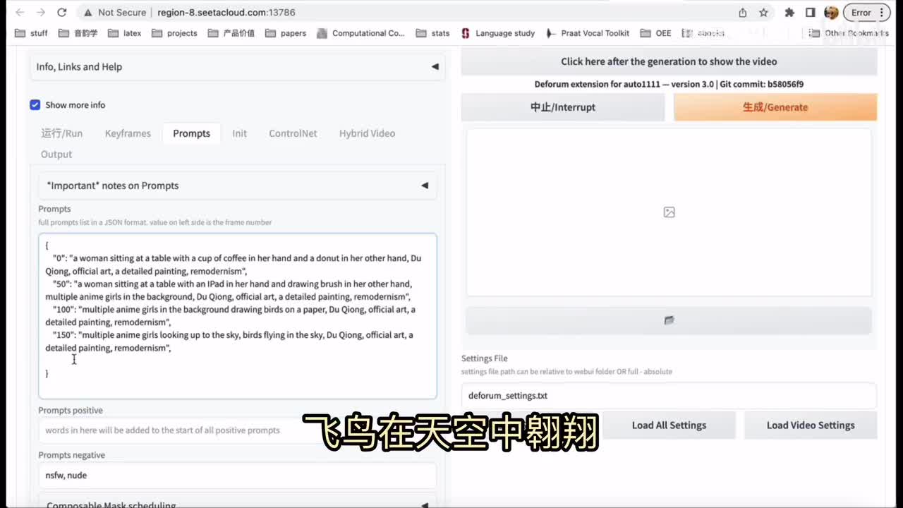 到这里我们就设置的差不多了。还想再补充一句,我们刚刚辛辛苦苦设置了这么多,如果以后想在其他的动画中继续使用,可以点击这里的fighting。下次打开的时候呢,点击load all settings,插件就会自动填充你刚刚的全部设置,可以说是一劳永逸。然后我们点击生成,开始念咒,生成之后呢,点击click here after the generation to show the video。