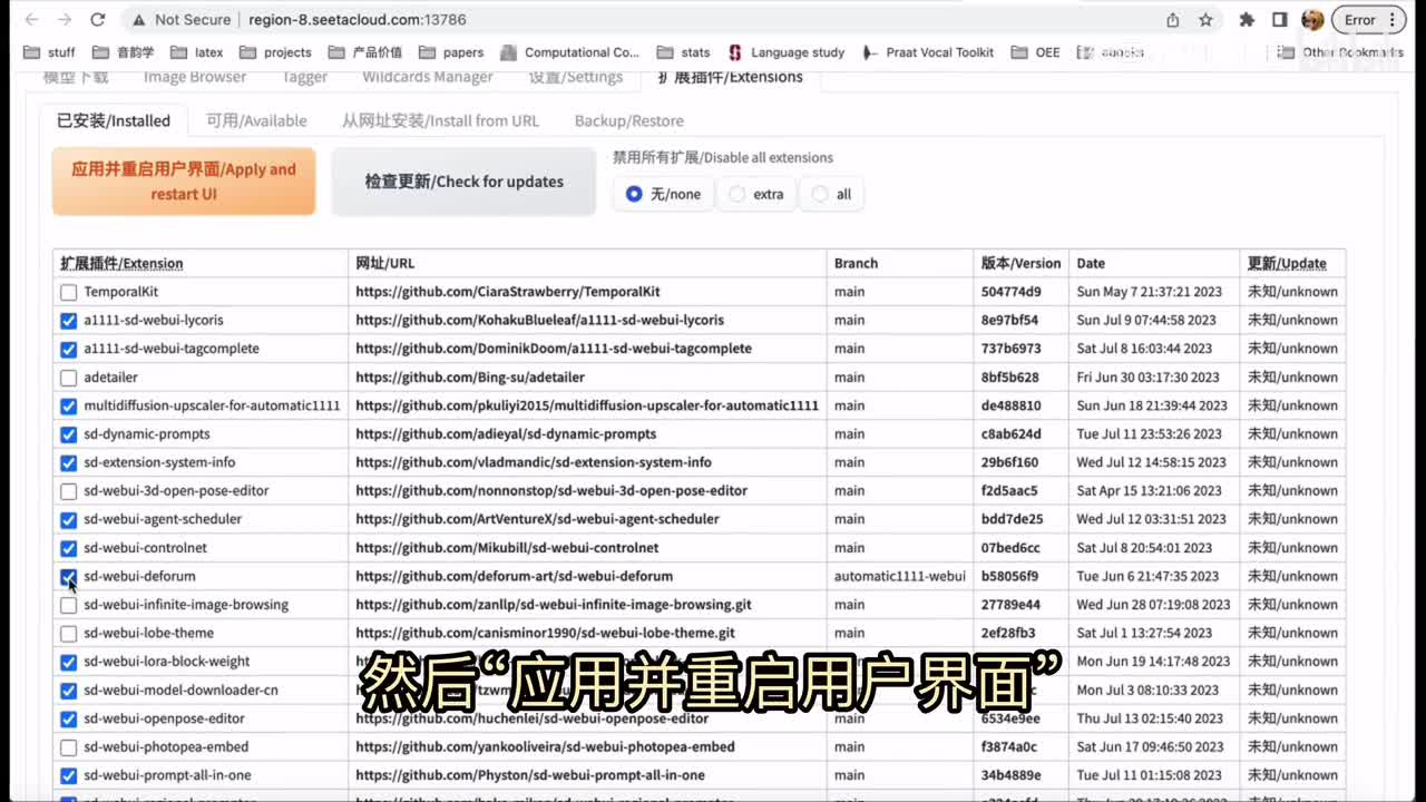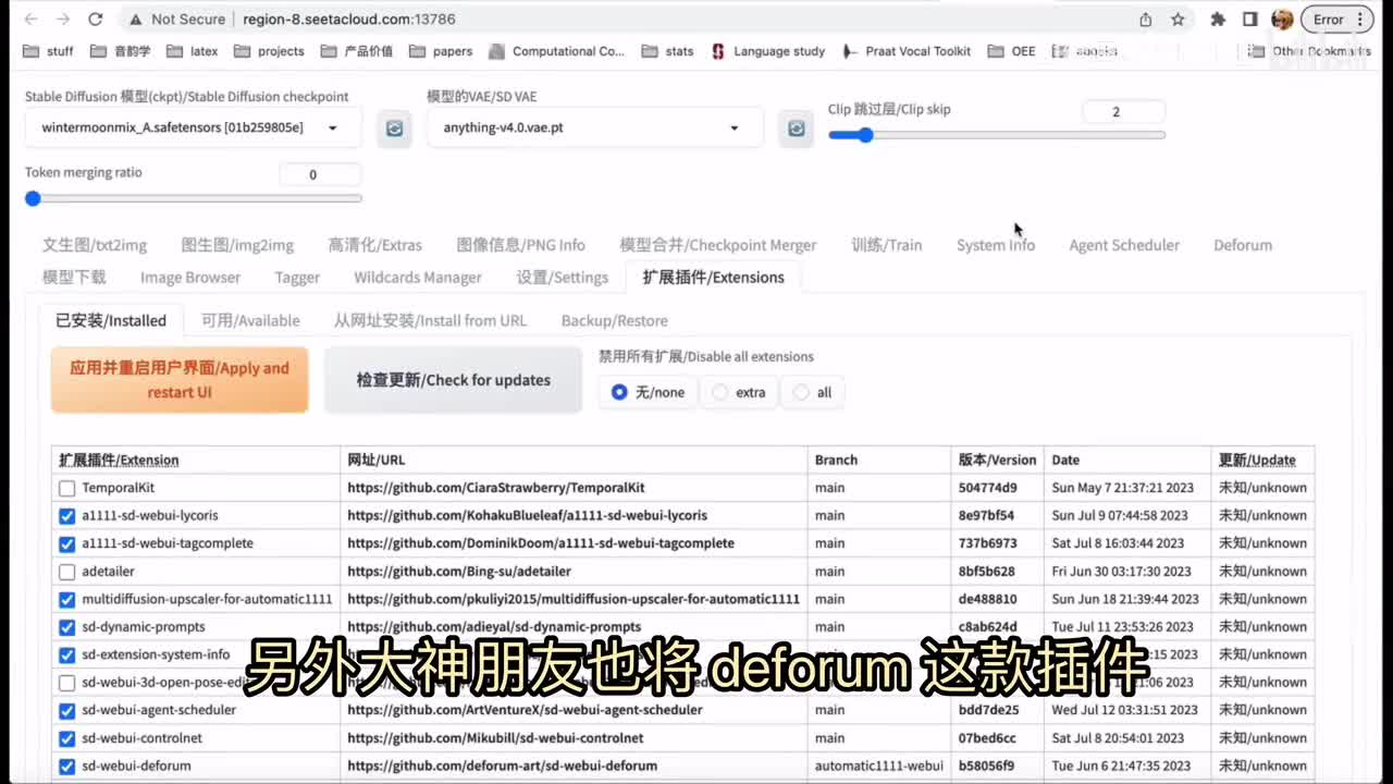 用这种方式让图片连续动起来,变成动画。话不多说,我们现在就开始打开web u i大神朋友因为已经预知了插件,只是没有默认展示。如果要使用的话,我们只要点击扩展插件,勾选s d web u i d follow,然后应用并重启用户界面,就可以看到上面出现了deep rom的选择区。这次我们还使用之前介绍过的冬之月模型,因为我想做的是一个开场动画,动画的最后呈现是小叶的人物形象,所以我要使用这张图片作为我们的初始图片。