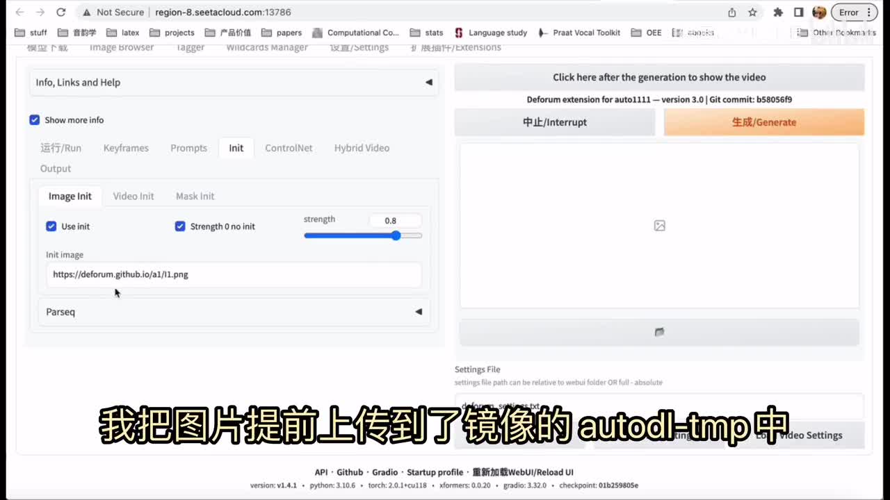 就直接让a i根据第一条pro所画的图,初始图,如果有的话可以用自己的图片。我因为用小妮的图片做了初始图,所以就需要勾选u s d nt使用初始图。然后这里要填图片的地址,我把图片提前上传到了镜像的auto b l t e m中,贴到刚刚的文本框,然后右键点击复制路径。因为是在镜像的目录下,所以前面要加上root当然你也可以上传到其他地方,把网址贴过来就可以。