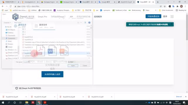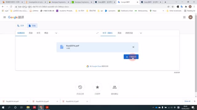 然后选择我们要翻译成的中文翻译,然后呢它这就上传中。好,为了节约大家的时间呢,我把这个已经有一个下载好的,对吧?已经翻译好的同样的文件,你翻译好之后可以点击下载,我这里面呢是呃再次下载它。