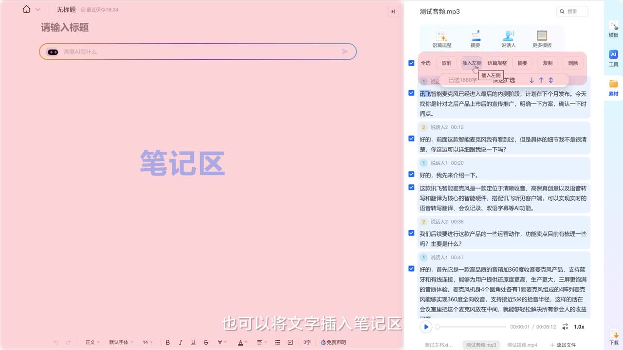 同样支持全文摘要语篇规整功能,也可以将文字插入笔记区进行改写、续写、缩写、扩写等处理。