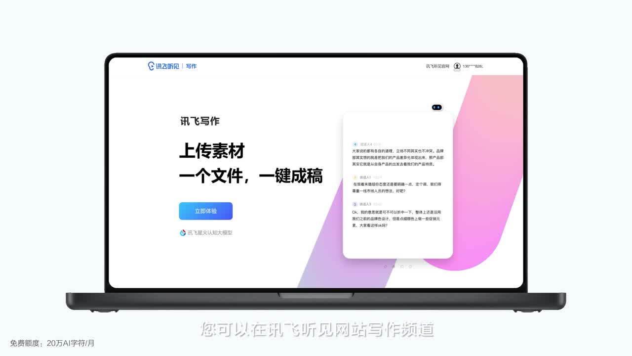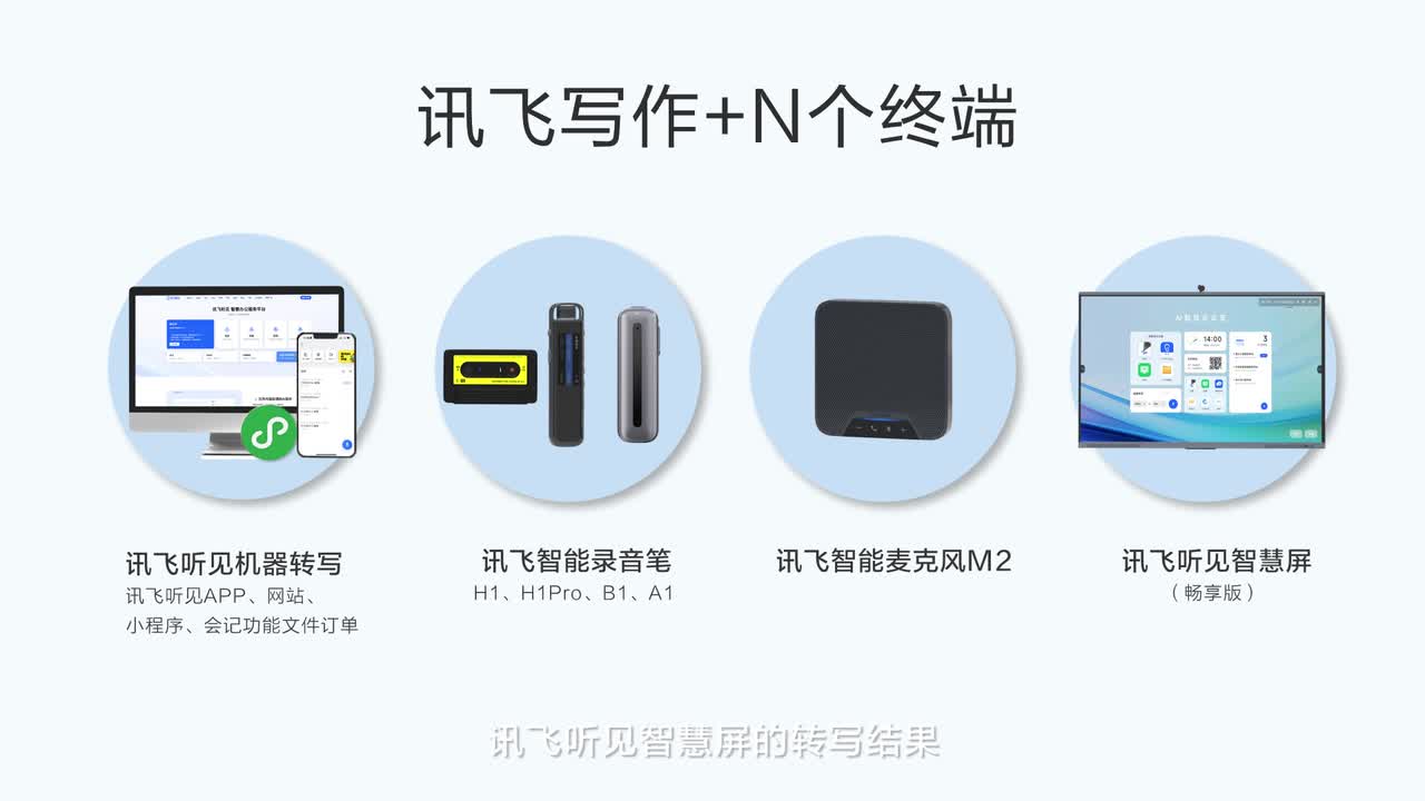 使用讯飞听见机器转写讯飞智能录音笔、讯飞智能麦克风m二、讯飞听见智慧屏的转写结果,均可以在讯飞写作功能中打开,并对转写内容进行ai创作。