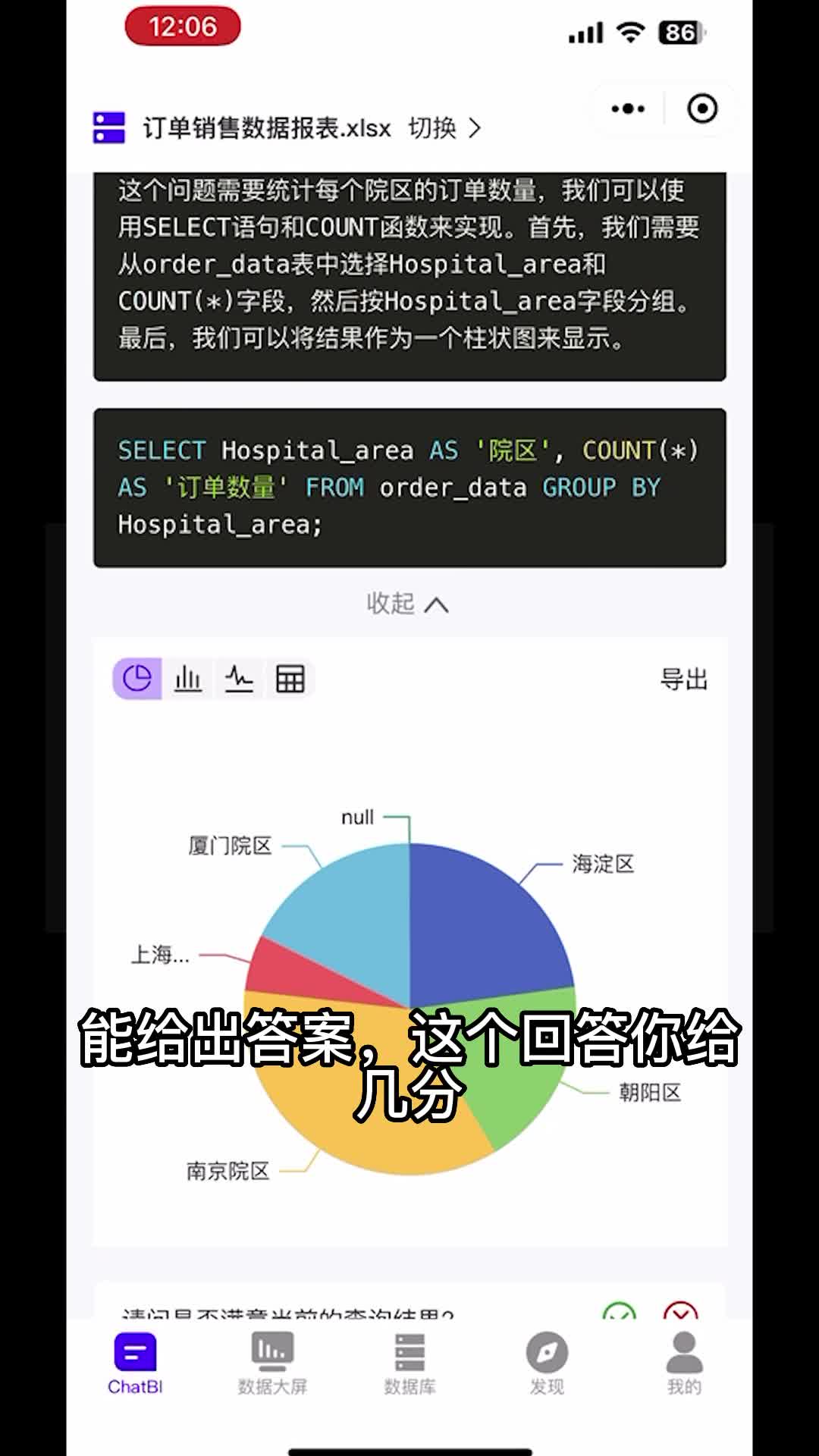 我们再来问他一个问题,有解题步骤,有色q能执行,色q能给出答案,这个回答你给几分?我们是一创科技,今天教给大家如何用chat b i快速进行自己的数据分析。以下都是干货。