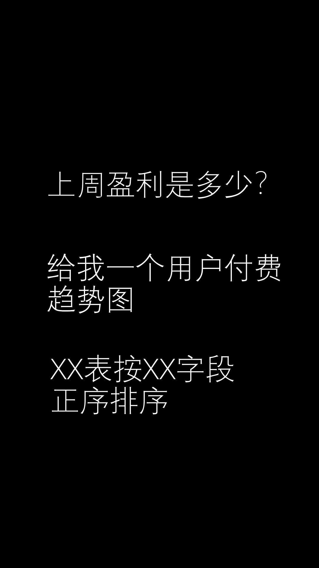 比如上周盈利是多少,给我一个用户付费趋势图,某某表按某个字段正序排序等。问题三,我的数据安全吗?会不会泄露?不会,我们采取了严格的措施保证您的数据安全。