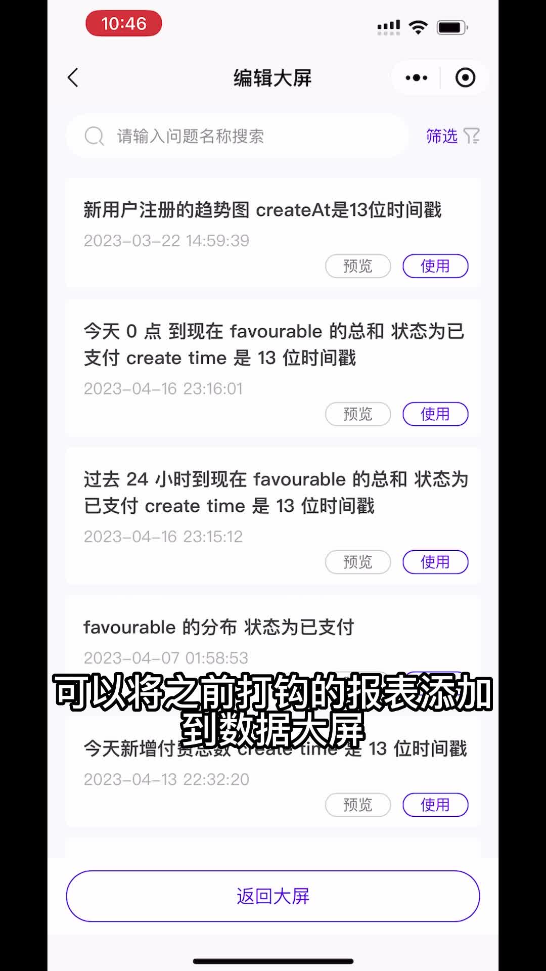 进入数据大屏菜单,点击编辑大屏,可以将之前打勾的报表添加到数据大屏。到这里基本教程就完毕了。