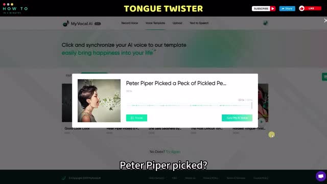 进入语音模板页面,选择。绕口令来测试这个ai有多好。如果你的声音不够好在这个测试中你可以改善你的声音,上传一个更好的声音。总之my vocal给a i。是一个不可思议的免费人工智能工具,可以克隆你的声音在短短一分钟内其易于使用的界面和强大的功能。