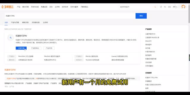首先我们在阿里云首页搜索机器学习趴,新用户有一个月的免费试用,大家可以体验一下。点击立即开通会进入空间详情。
