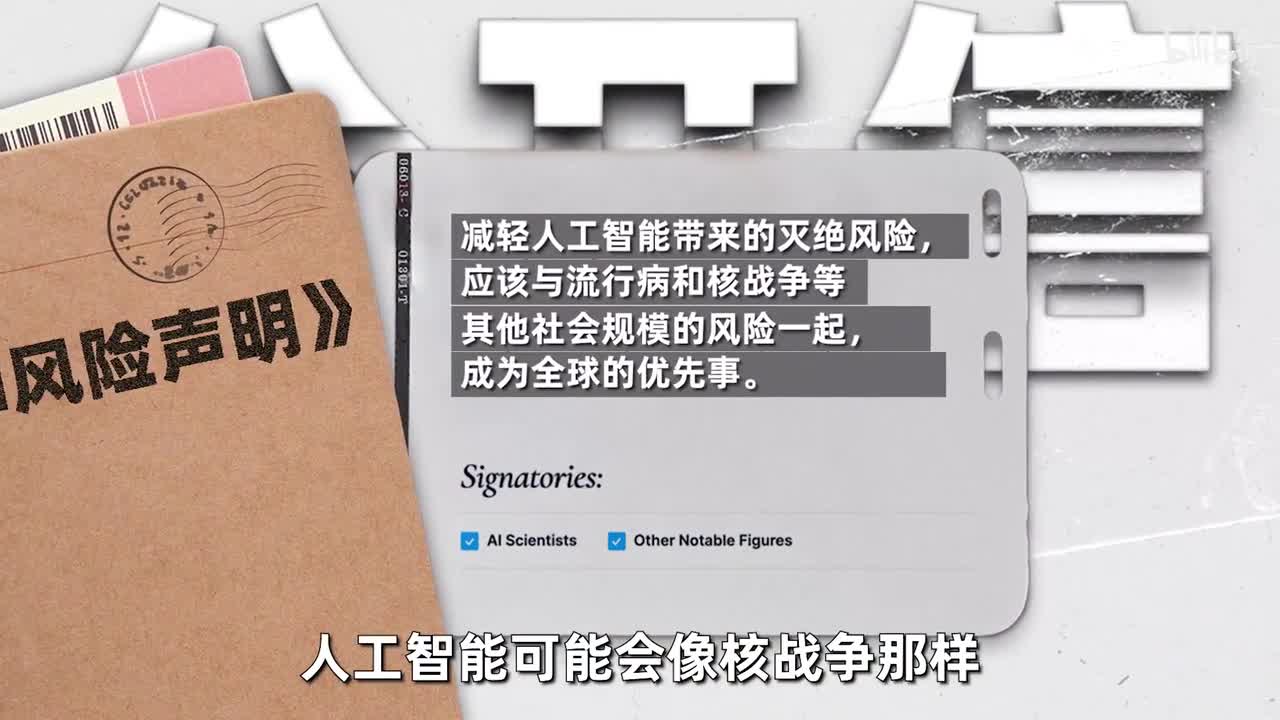 抄了g p t大赛后,关于a i的讨论从来就没有停止过。今年五月底,三百七十多名a i从业人员联合签署了一封公开信,瞬间引爆了全球科技圈。这份a i风险声明警告称,人工智能可能会像核战争那样给人类带来灭顶之灾,全世界应该行动起来,降低人工智能灭绝的风险。总之啊这封警告信得到了包括a i顶尖企业open a创始人,老牌科技巨头微软和谷歌等多名高管,多位行业大佬的支持。