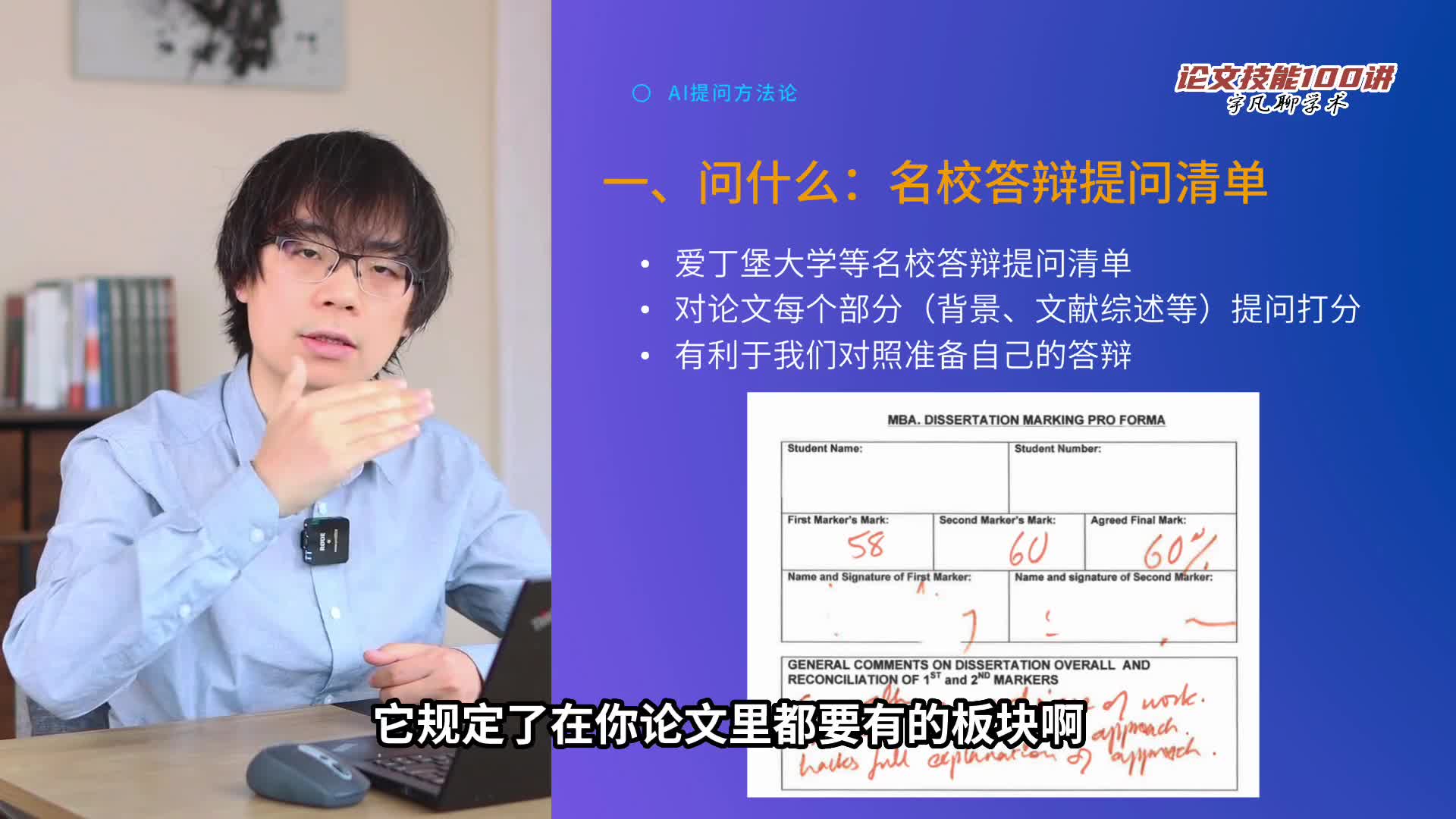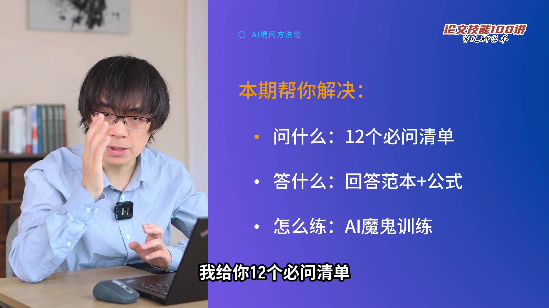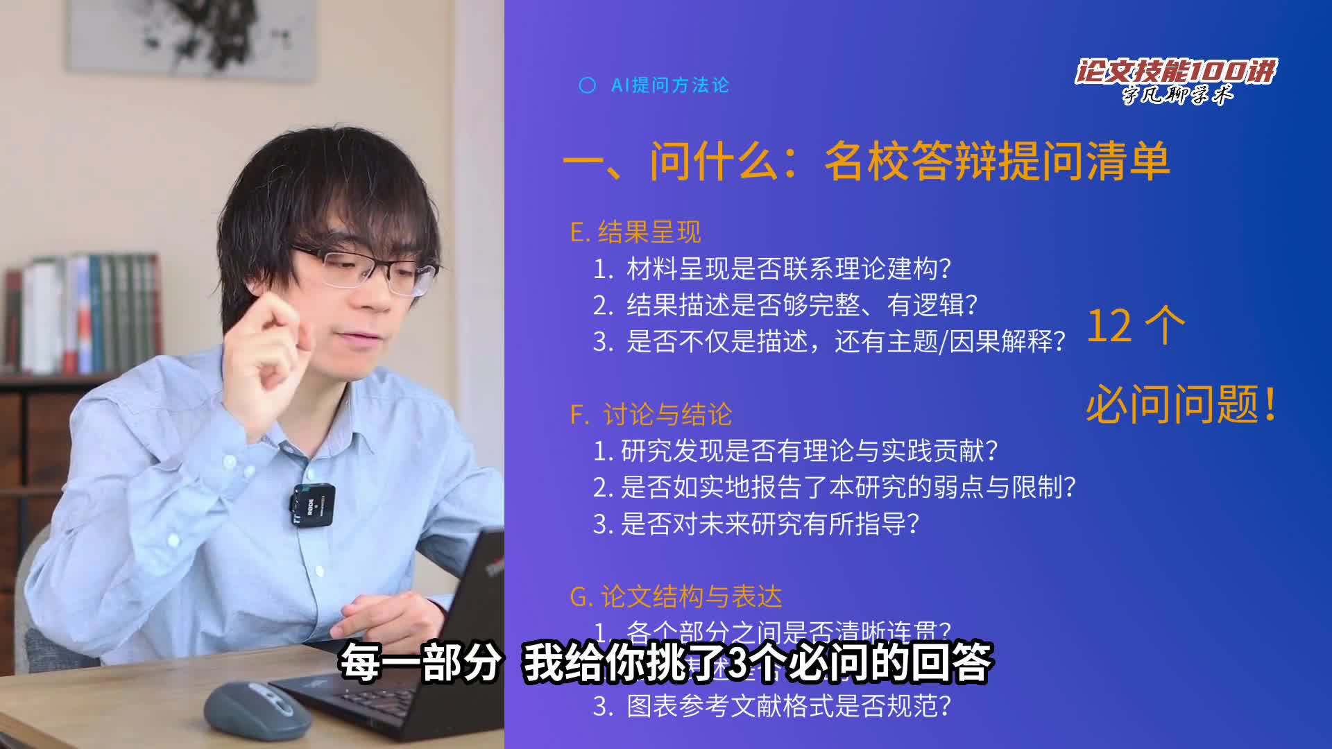 这一讲我们来讲讲论文答辩,下一讲我们还会来分享怎么用g p t帮你读文献。当然如果你还有什么想听的,你也可以在留言区补充,我们一起来探讨。我们这一期就来告诉你三个角度。第一问什么?我给你十二个必问清单,掌握这个清单,你的答辩一帆风顺。第二答什么?我这里告诉你g p t回答的内容,反映出来的三种回答范本及其思考的逻辑。掌握了这个再多的问题你都不用怕了。