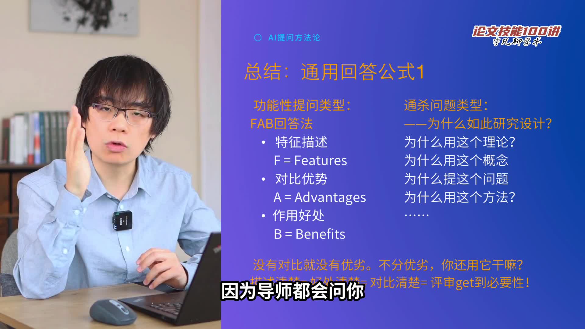 唉,这可能你开始是不知道的,所以呢这里就你进一步的延伸出来,你看我毕竟有优势,所以我能抓住这个研究中最需要的部分,它有一定的好处。所以这个研究就会告诉你,你看你可以理解这些大学生他们的家庭怎么看待这些事,他们的意义和观念是什么?这是定性研究的优势嘛。这一套f a。b回答法呢针对于功能性问题,它是通用的。因为导师都会问你为什么要这么设计啊?为什么要用这个理念理论啊,为什么用这个概念?为什么用这个问题啊,为什么用这个方法啊?因为为什么你就蒙了?这个时候要记住f a b回答法,特征描述对比优势作用好处。因为没有对比就不知道优势在哪里,你没有优势比较你用它干嘛呢?所以你要理解这一点,他背后的逻辑啊就在于他教你怎么把导师把评审看成像你的客户一样,甚至像你的对象一样。
