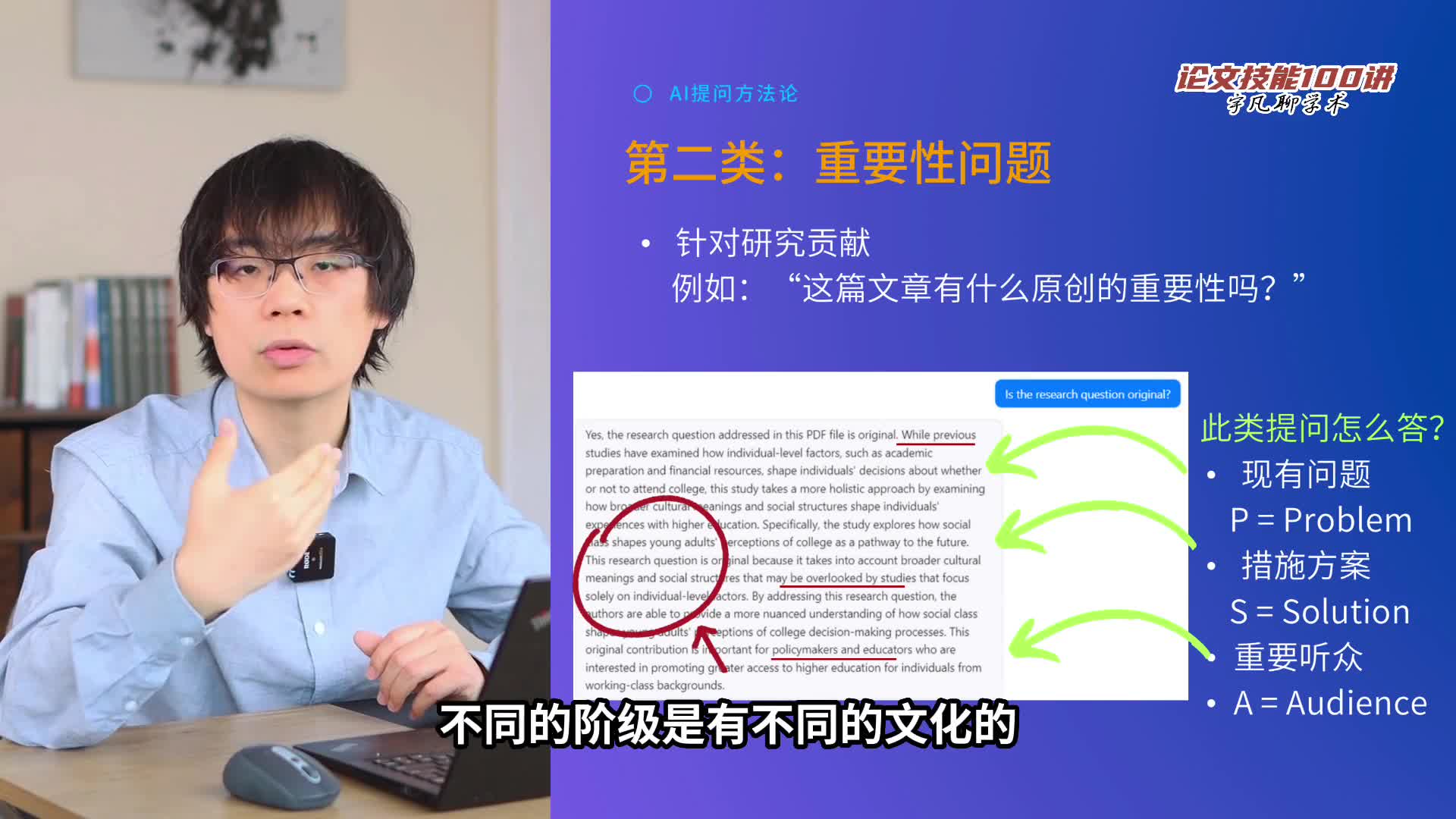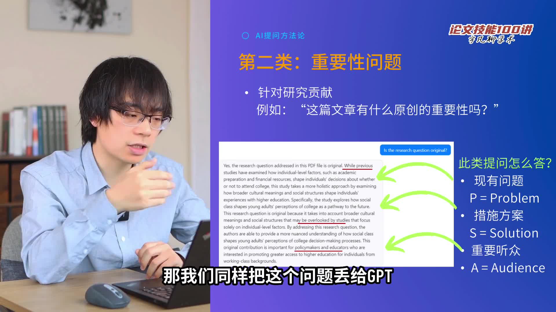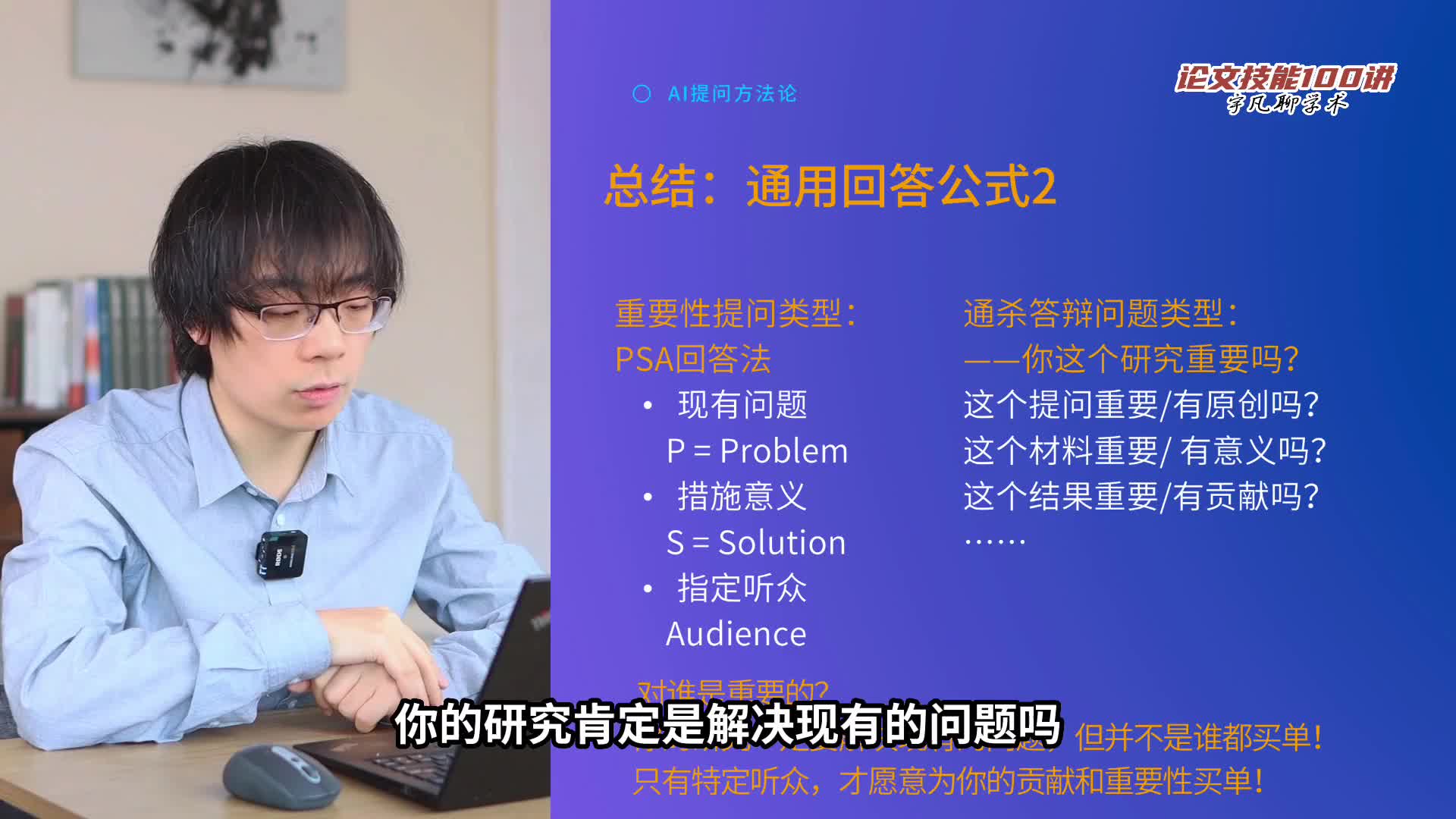 你要让他觉得啊这一单我非签你不可,我非跟你谈恋爱不可。因为你确实比别人好多了,有优势太多了。那么第二类难题呢是重要性问题,往往针对于你论文的贡献。评审老师肯定会问你,你这个论文有什么原创性吗?对吧?你花几万字来写它,那我们同样把这个问题丢给p p t,你看他会来怎么回答呢?他的回答我给你总结出来是p s a回答。他告告诉你之前研究有什么问题,然后把你的研究。看成是一个解决措施解决方案,然后告诉他我针对于特定的听众和读者,他的意义重大。