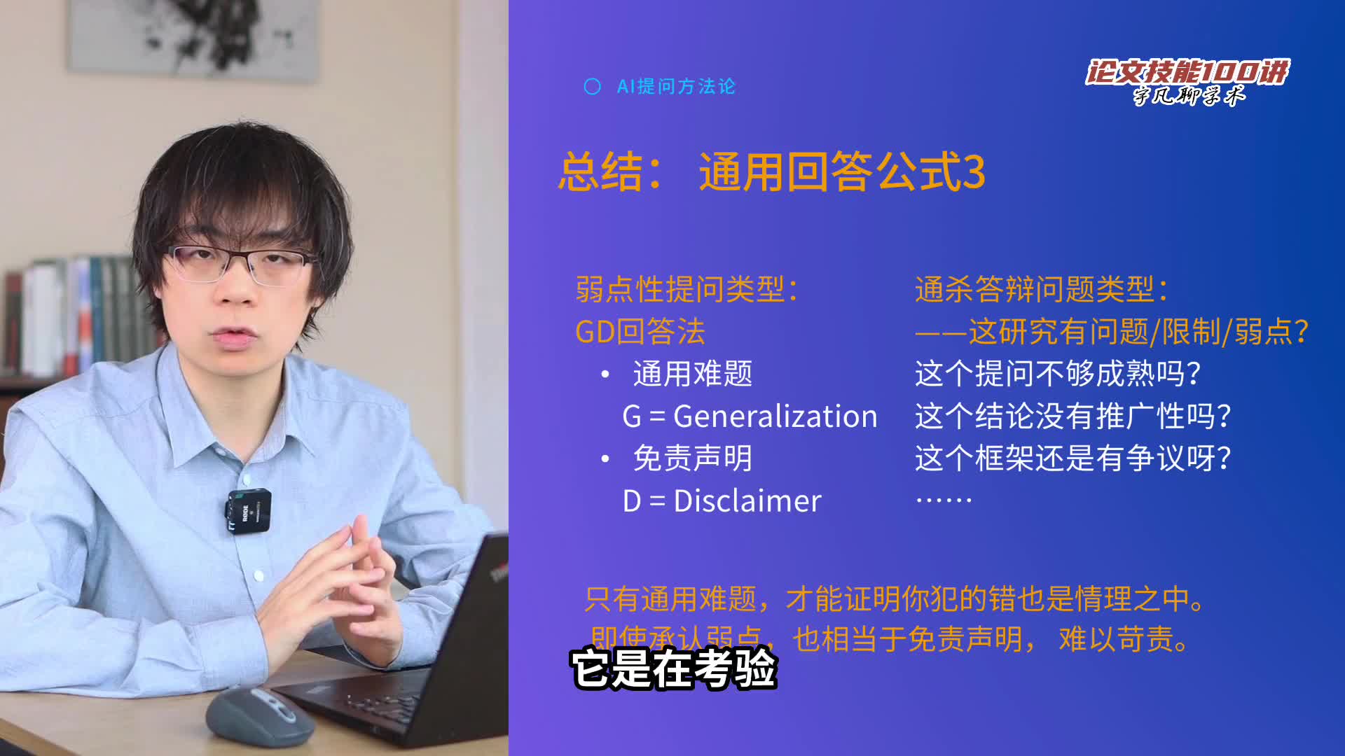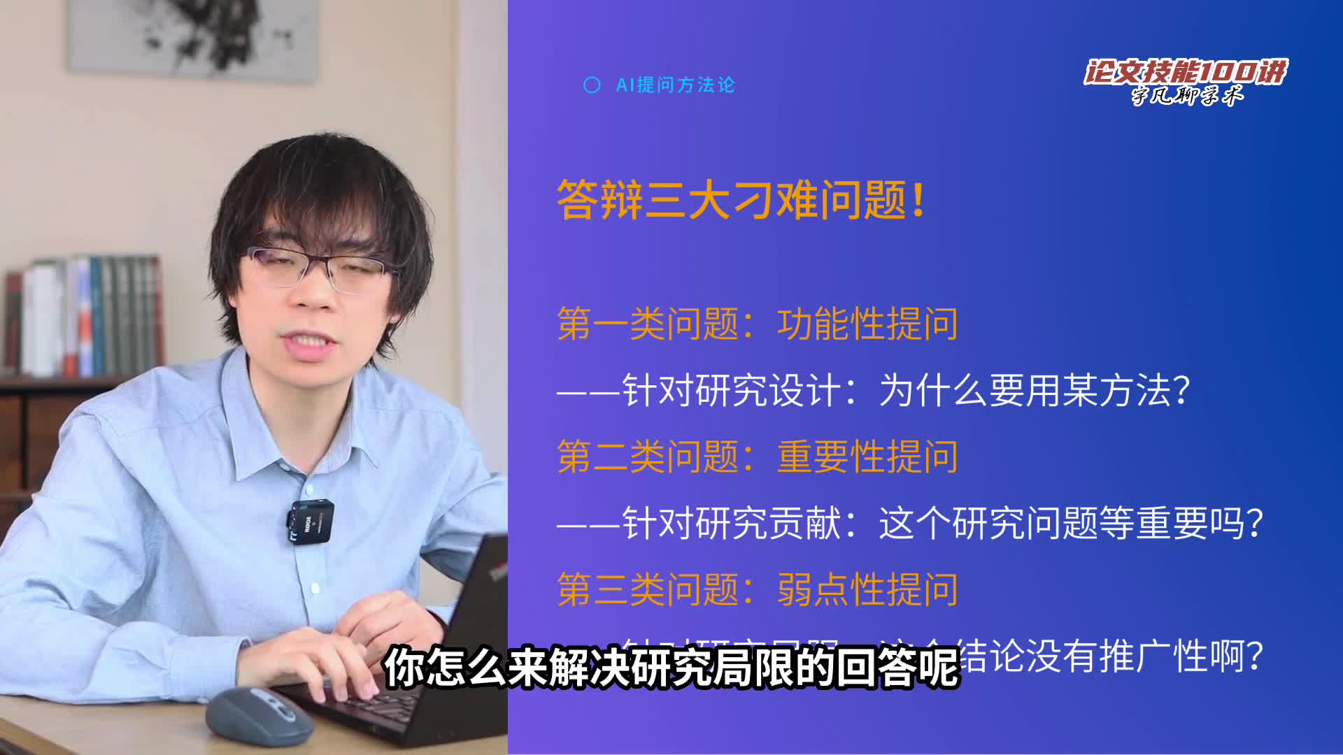 扮演的功能呢类似于一个免责声明,就是这是方法理论框架本身会有的问题。那我就是一个硕士生本科生,我现阶段解决不了也合情合理。那么这种类型的问题形式呢,他会问哪些啊?这个提问为什么不成熟?你的结论有没有推广性?你的结论是不是有争议啊?有的小伙伴会觉得这种问题是导师在刁难你,其实不是,他是在考验你自己有没有意识到这一点啊,并不是真的想让你来解决它。所以你尽量回回答,让你的评审觉得你你犯的错呢是合情合理。但是别忘了,一定要在你的论文中先承认这一点,要体现你的态度和责任。那有的小伙伴也会好奇说我这个框架,这个方法究竟有哪些通用的问题,能够让我在一一定程度上啧啧呢?其实这也蛮简单,可以了解。