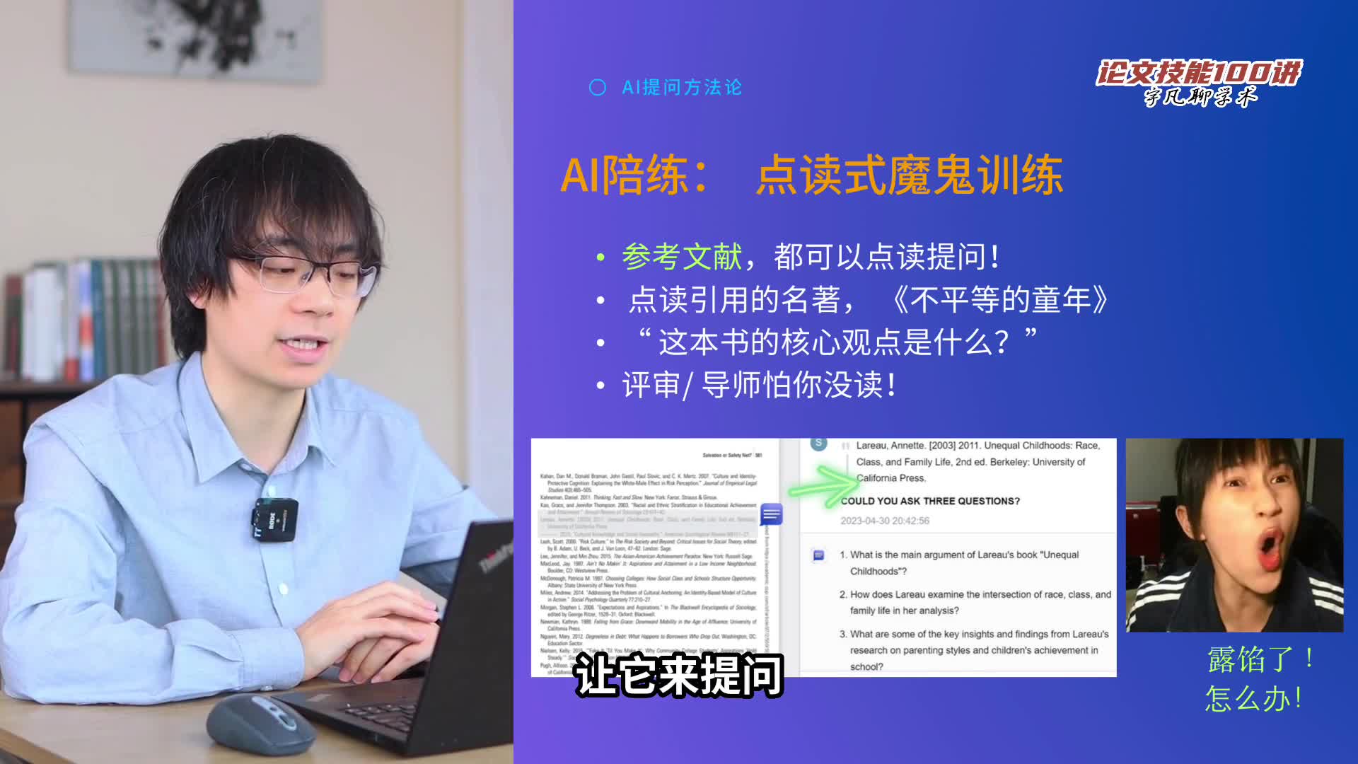 他问到说唉你论文说到这个中产阶级的父母孩子啊害怕向下流动,唉,究竟是怎么回事啊?究竟他们是怎么看待上大学的呀,怎么看待风险啊?所以。尤其对于案例部分,这种点读法非常有用。那接着呢其实每个部分你都可以点读,还有一些你更害怕的地方了。比方说参考文献,导师会说你真的读没读过啊,你也可以在这里参考文献的部分你在上面点唉,让他来提问,而且一样问的非常好。你看他这里就会问说啊这一个什么不平等的童年,你引用的这本书核心观点是什么啊,怎么分析的呀?哎那么接下来实际上你也可以把这本书再丢给p p t,让他再来帮你总结,你不就解决这个问题了吗?好,那么最后呢当然就祝大家毕业论文啊答辩顺利啊,我们下一讲呢就会来教你怎么用g p t五分钟让让你读完一篇文献,我们下一次再见。