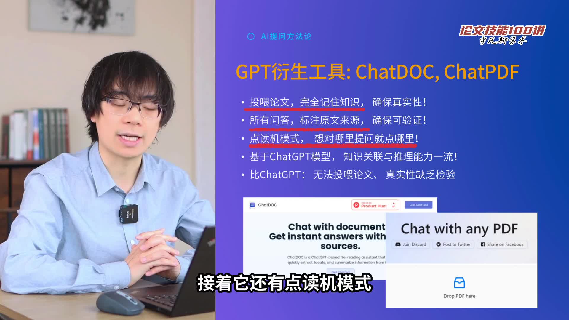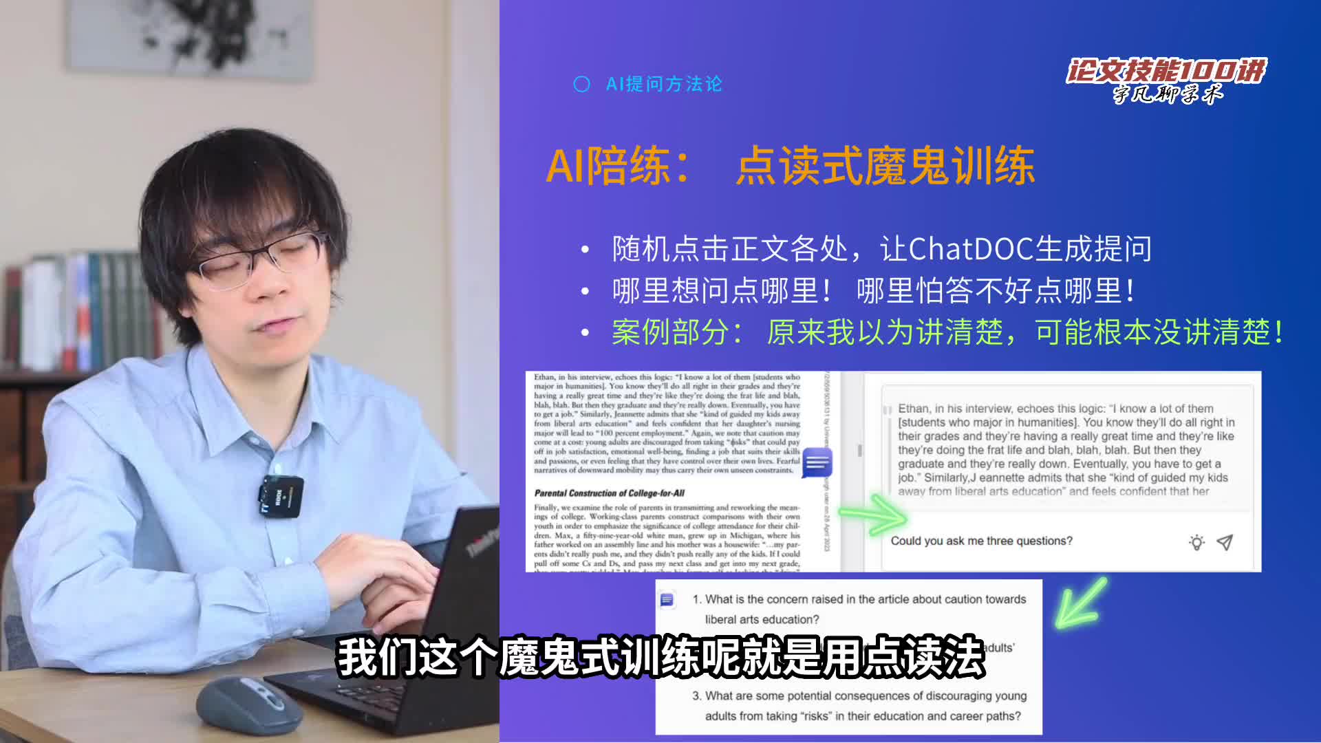 所以你在准备答辩的时候呢,你也可以按照这三种思维方式呢来组织你的答案。好,接着我们知道了答辩会问什么,也知道了回答要怎么回答。最后就到第三部分,怎么练?我总要事先对着镜子也好来准备准备吧。但究竟要怎么练呢?这里告诉你,用g p t可以帮助你魔鬼式训练。我们这个魔鬼式训练呢就是用点读法,点读机大家都知道吗?哪里不会点哪里,对不对?我们论文也一样,你哪里怕老师问你就点哪里,怎么做到呢?因为我们这个g p t的衍生工具chat dock,它具有这种可视化功能,让你来选择论文的特定部分。这里有冒泡的地方,你看到了吧?然后你只要点一下接着问说唉这一部分你来问我三个问题,你看它质量都很高,也贴合这个论文的意思。