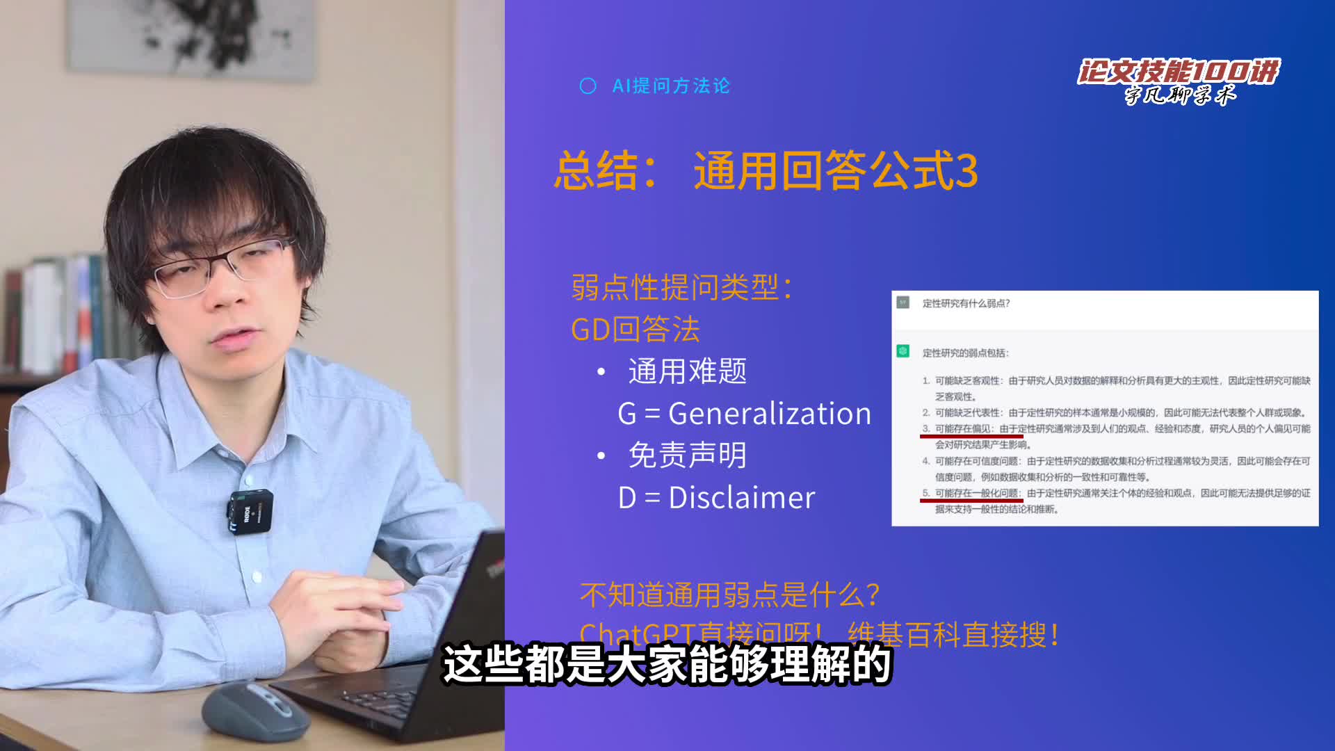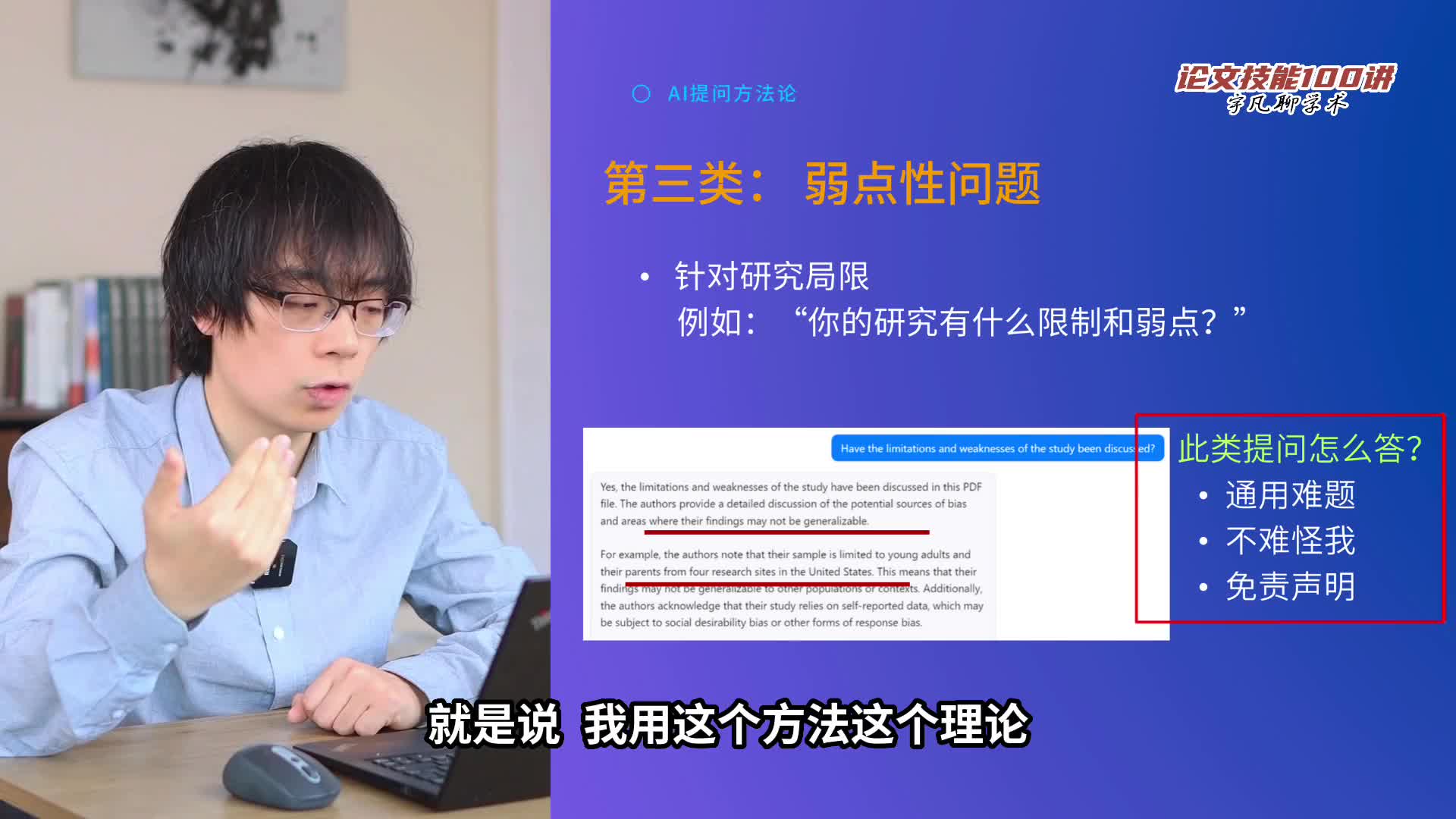 那么第三类会难倒你的提问是弱点性提问,它主要针对于你研究的局限性。导师会问你,哎,你的研究有什么限制和弱点啊?哎呀,这时候好像有露馅的感觉,对不对?那你要怎么答呢?你看我把这个问题丢给g p t,他回答的逻辑啊实际上是在于你要给出一个通用的难题。就是说我用这个方法、这个理论、这类研究往往会有这个难题,所以呢他也没有办法特别怪我。比方说他这里的给出的答案就在于说啊,我是用定性方法,但我的定性方法不容易推广。那么我的案例是来自于美国总是有些偏见呢,有些局限性。它实际上。