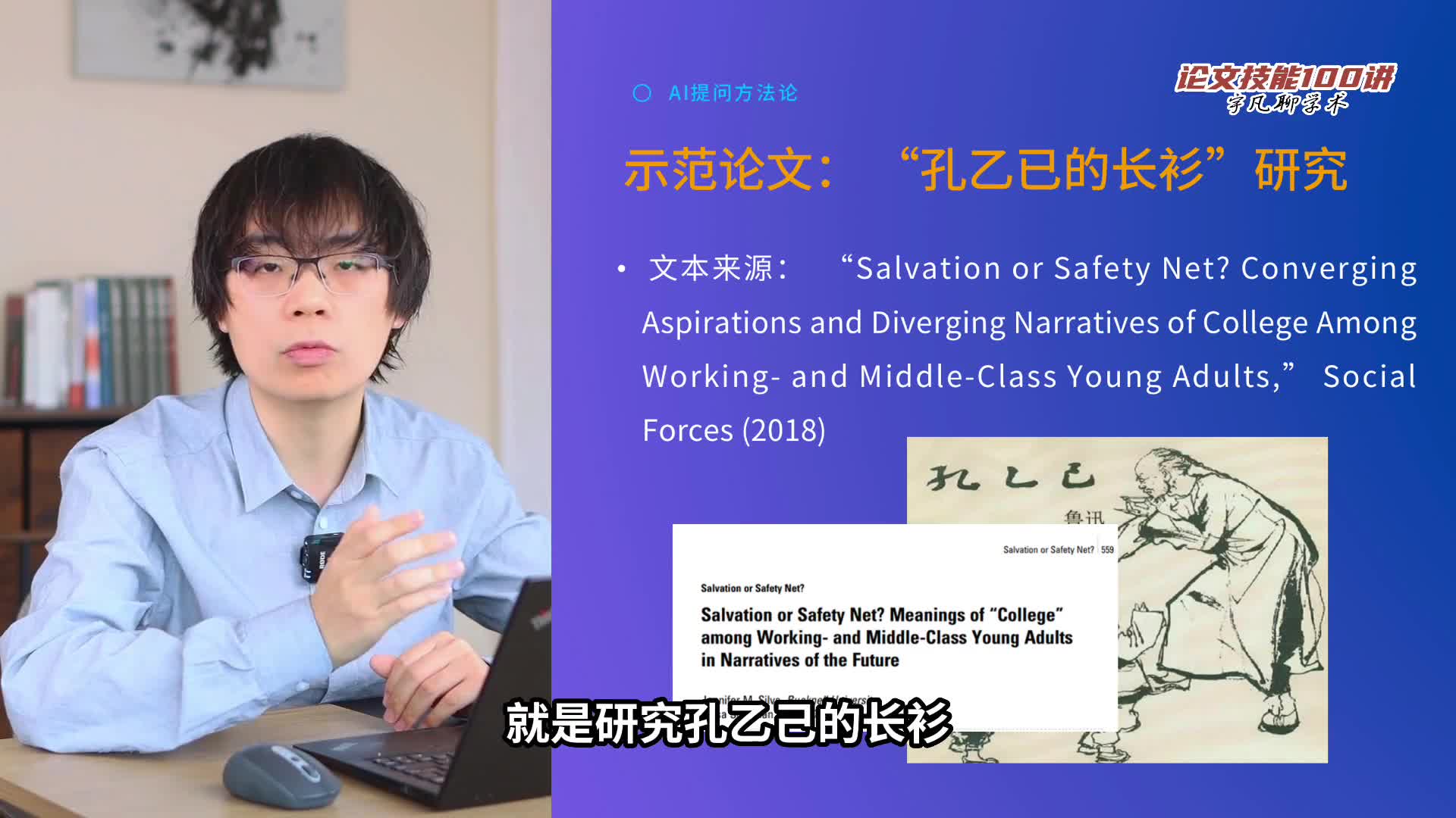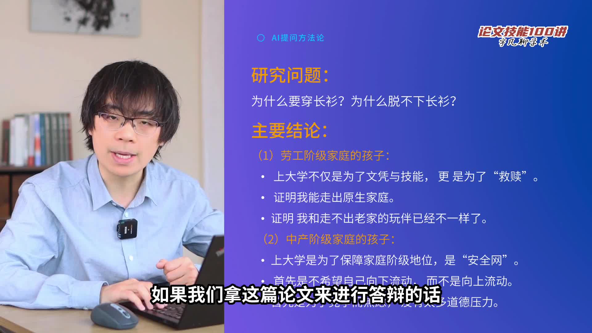 他也发现说其实对于中产阶级家庭,他们穿长衫和脱不下长衫原因有点不一样。因为中产阶级孩子的这些孔乙己啊,他们上大学啊是为了保证家庭的阶级地位,是一个安全网的功能,也不是说有太强的道德压力。那么如果我们拿这一篇论文来进行答辩的话,看看g p t究竟会怎么帮助我们。我这里来挑三大提问类型是最难的一些问题。第一类就是功能性问题,往往针对的是研究设计为什么要用这个方法?为什么用这个理论啊?老师会这么问你。第二类问题是重要性问题,往往针对的是研究贡献。