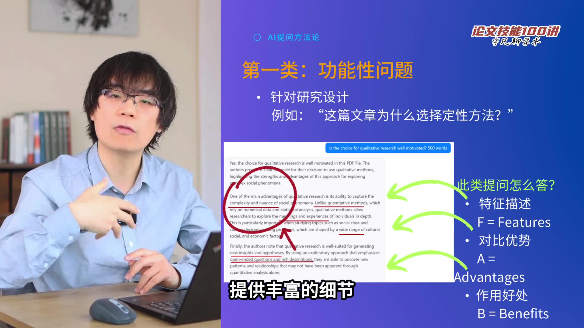 回答法什么意思呢?就针对于功能性问题,你可以先进行特征描述,然后呢对比说出它的优势。接着呢再告诉你的评审老师用这个方法会有什么样的好处。比方说为什么要用定性方法啊,这篇研究就会告诉你哦,定性方法呢是要去仔细观察开放性提问,提供丰富的细节。唉,描述清楚了,接着呢你看g p d的回答又给我们一个启发,就是你要有对比,说不像定量研究,因为定量研究开始都已经固定好了,用什么测量什么指标。但是呢对于定性研究,它往往比较开放性,会生成新的假设。所以你去才能发现哦,原来真实的情况是两个阶级不一样。