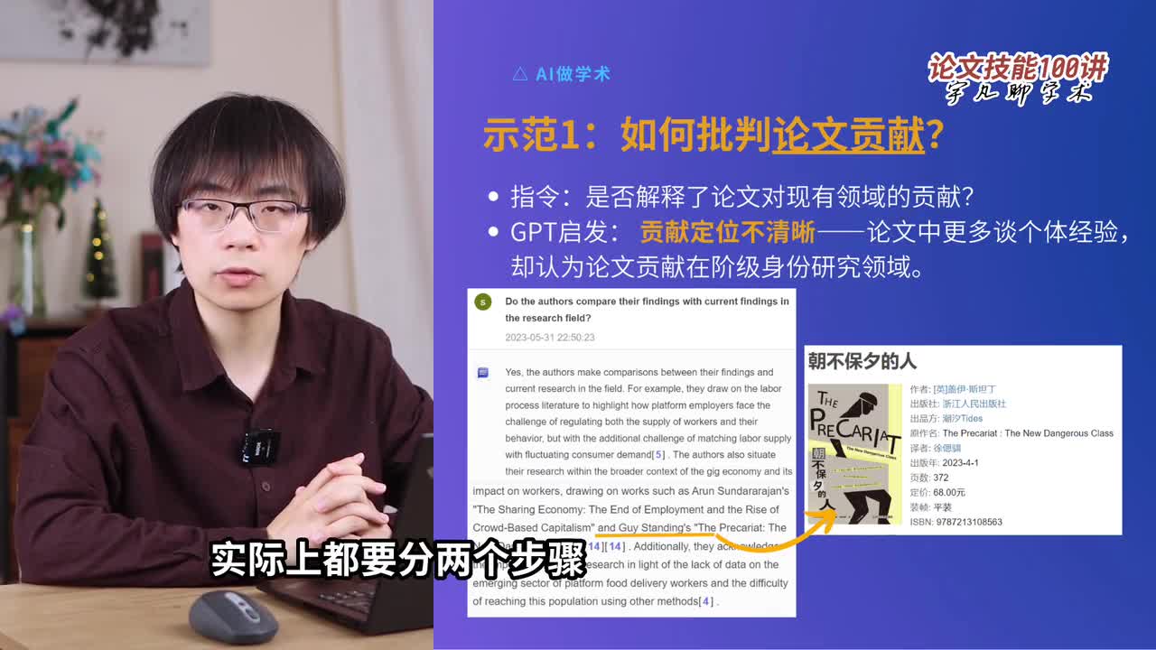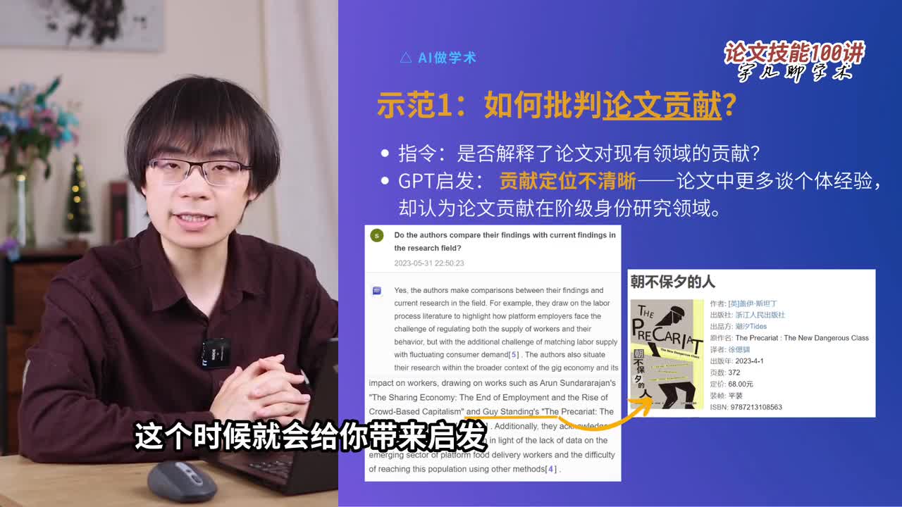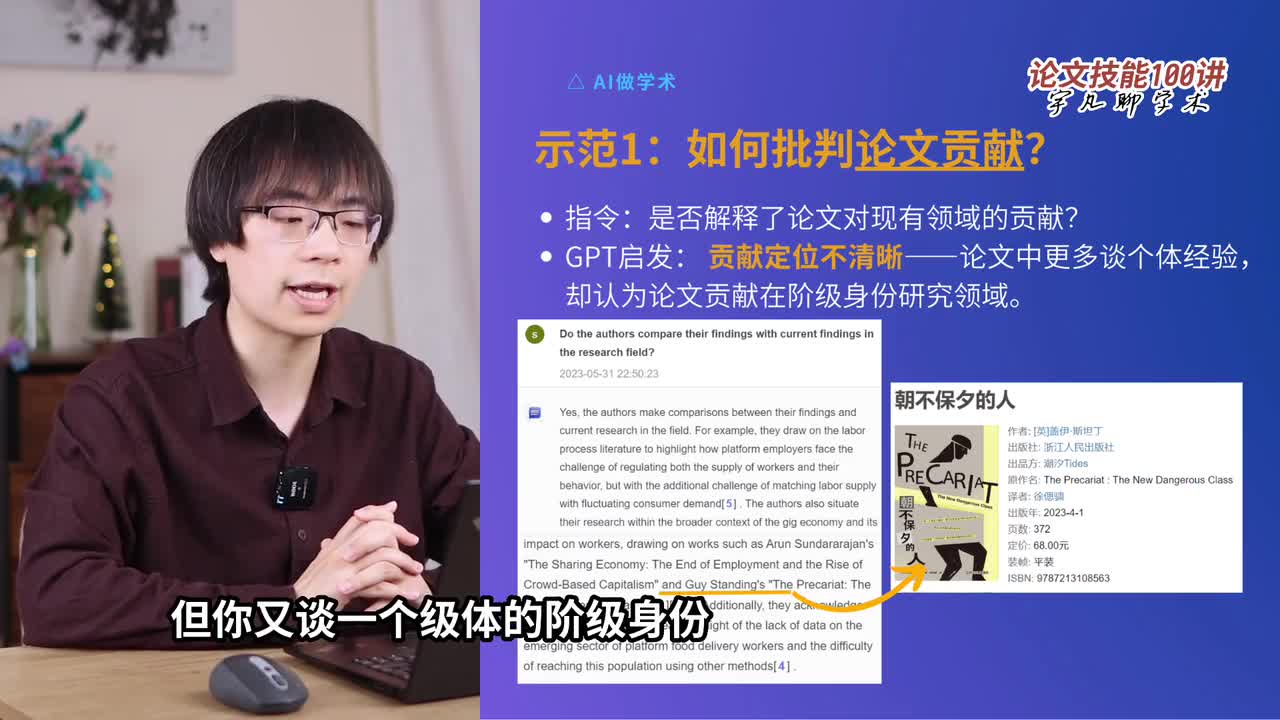 然后对他提出这样的问题,你会发现g p t给你的回答还是非常有启发的。你像他这里给出的回答就会告诉你,哎,确实也可以联系到这样朝不保夕的人。这本书的阶级视角,这个时候就会给你带来启发。如果你回到这篇论文,再来对比阅读这篇论文和这本书,就会发现哎,他好像只是在研究个体,没有讨论什么阶级问题啊。我再来给你看第二个批评阅读的角度,就是批评他的论文结论。