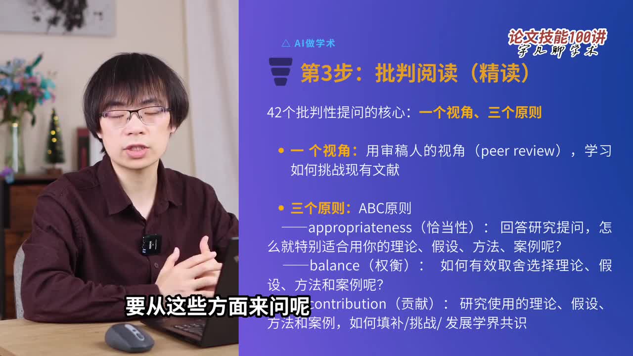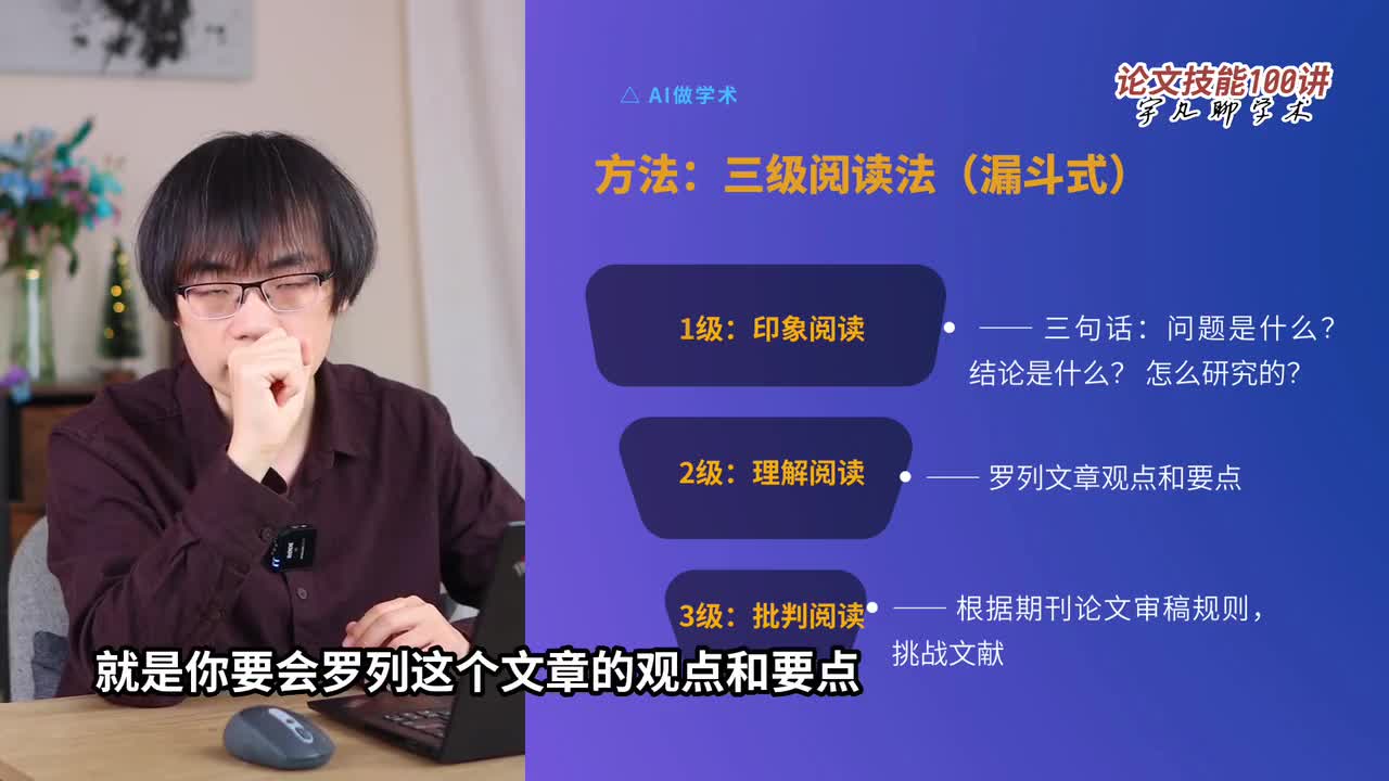 我们这一期会来帮你解决,五分钟就可以用a r帮你速读一篇文献,而且a r还可以帮你一分钟自动做笔记。接着当你想要重点精读的时候,我会告诉你按照哪三个原则进行精读和批判。我们今天这一期呢已经是关于a r做学术系列的第四讲了。如果前三讲你还没有看过,我可以去我的主页观看了解如何实现一天读一百篇文献呢。哎我这里给你提供一个三级阅读法。