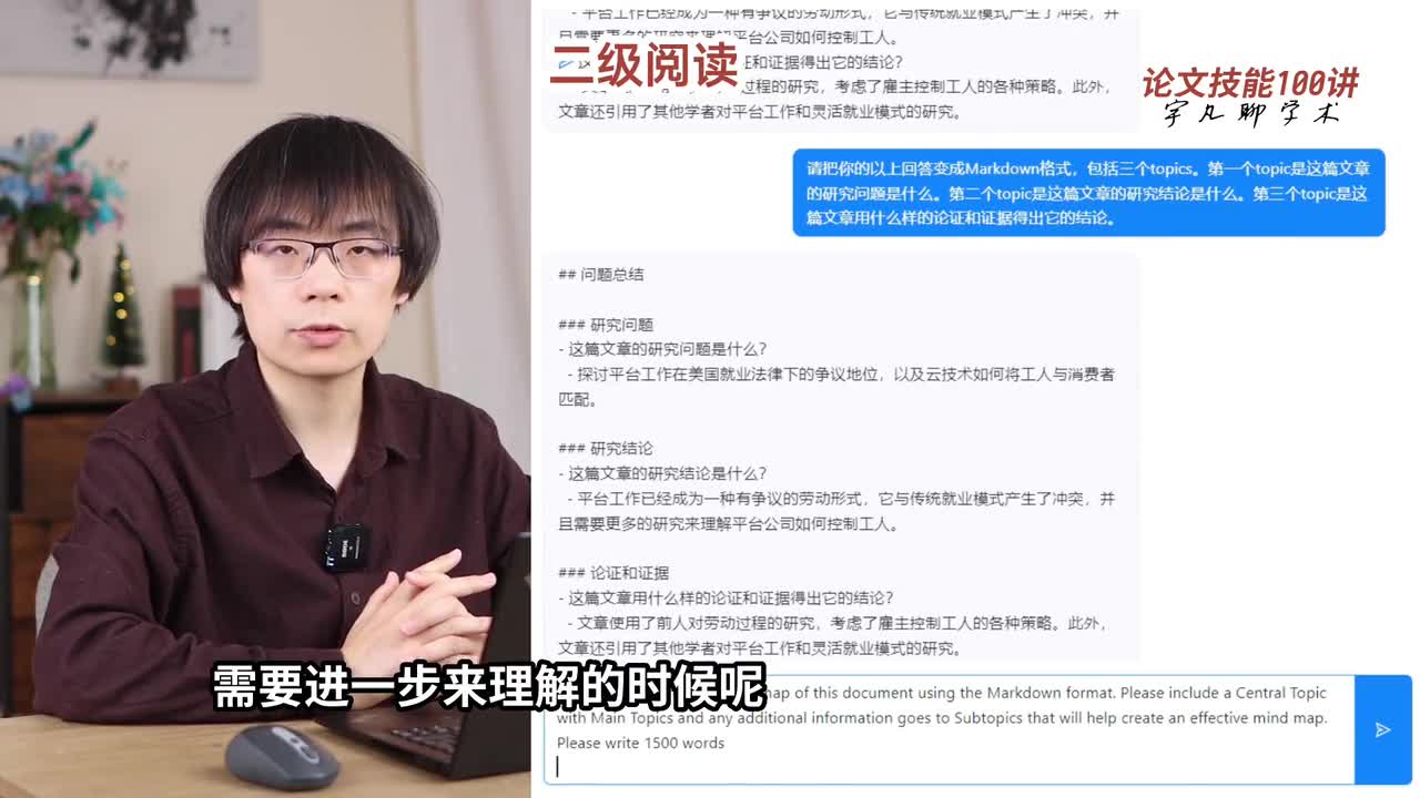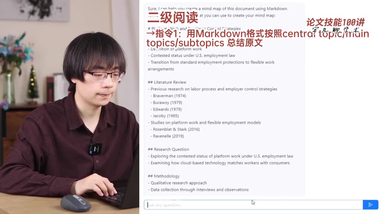 跳到mark mac的网站里直接粘贴进去,你会发现右面立马生成了一个思维导图。现在你就能看到一级笔记它就已经自动做完了啊。当你通过一级阅读觉得这篇文章有意义,需要进一步来理解的时候呢,哎你就可以用我们的二级阅读的方法,要抓住它的要点。现在同样的我用g p t来操作演示来给你看。我现在同样跟它输入指令,让它生成markdown格式的思维导图,要包括各种topics。