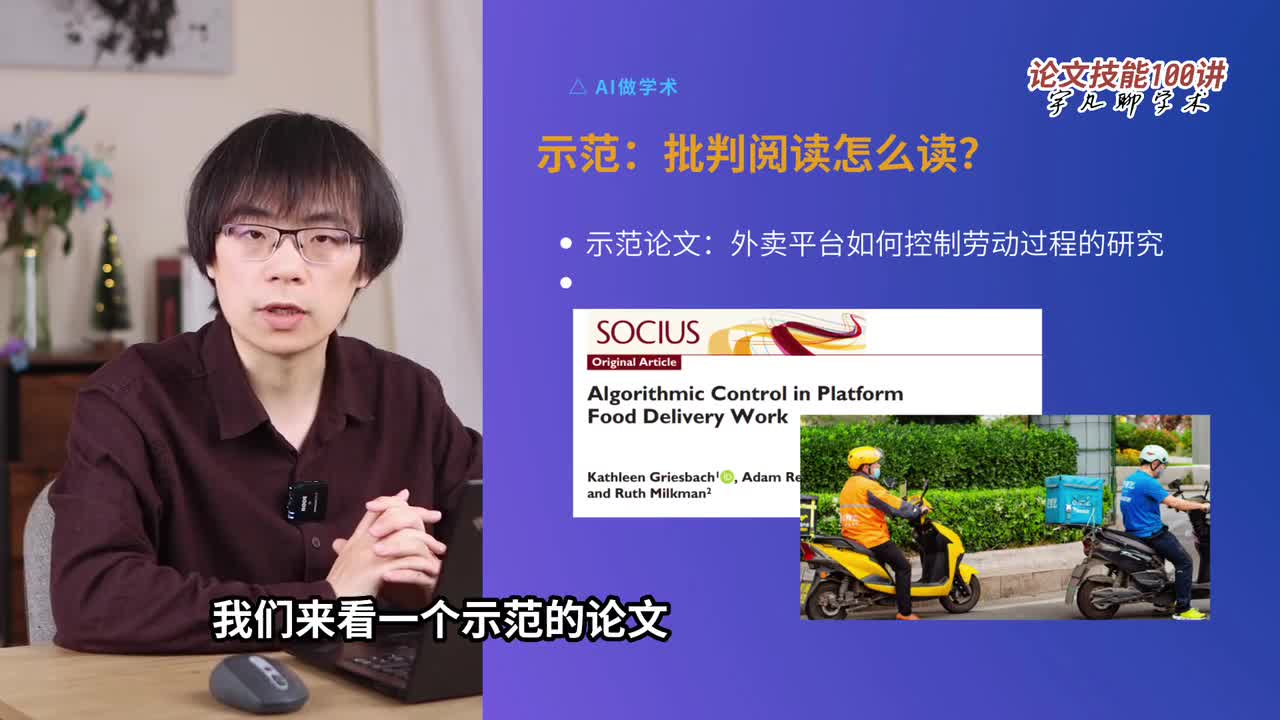 你就理解这四十二个问题的提问角度了啊,这么说还是有点抽象了。我来给你展示一个论文,告诉你我是怎么进行批判阅读的。我们来看一个示范的论文,就是在研究外卖平台如何控制这些外卖员的劳动过程的篇论文。已经现在经典文献了,引用率非常高。因为它联系到我们现在非常关心的问题,我们都说外卖员被困在系统里。