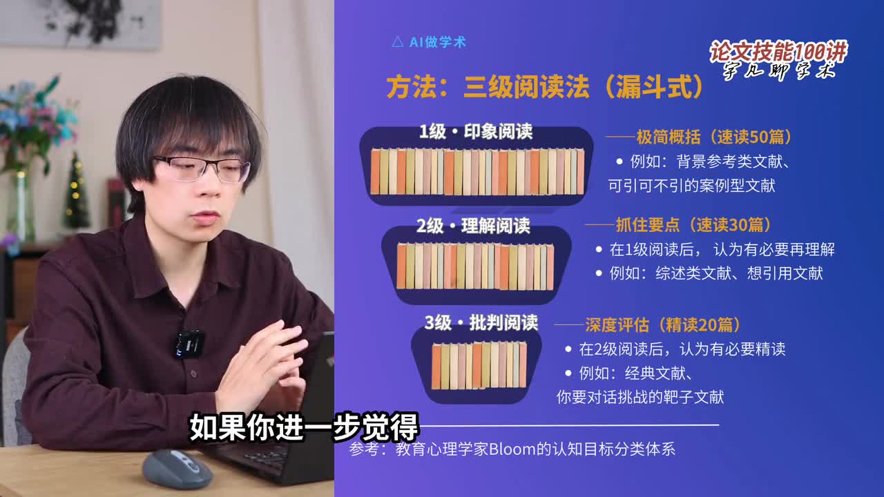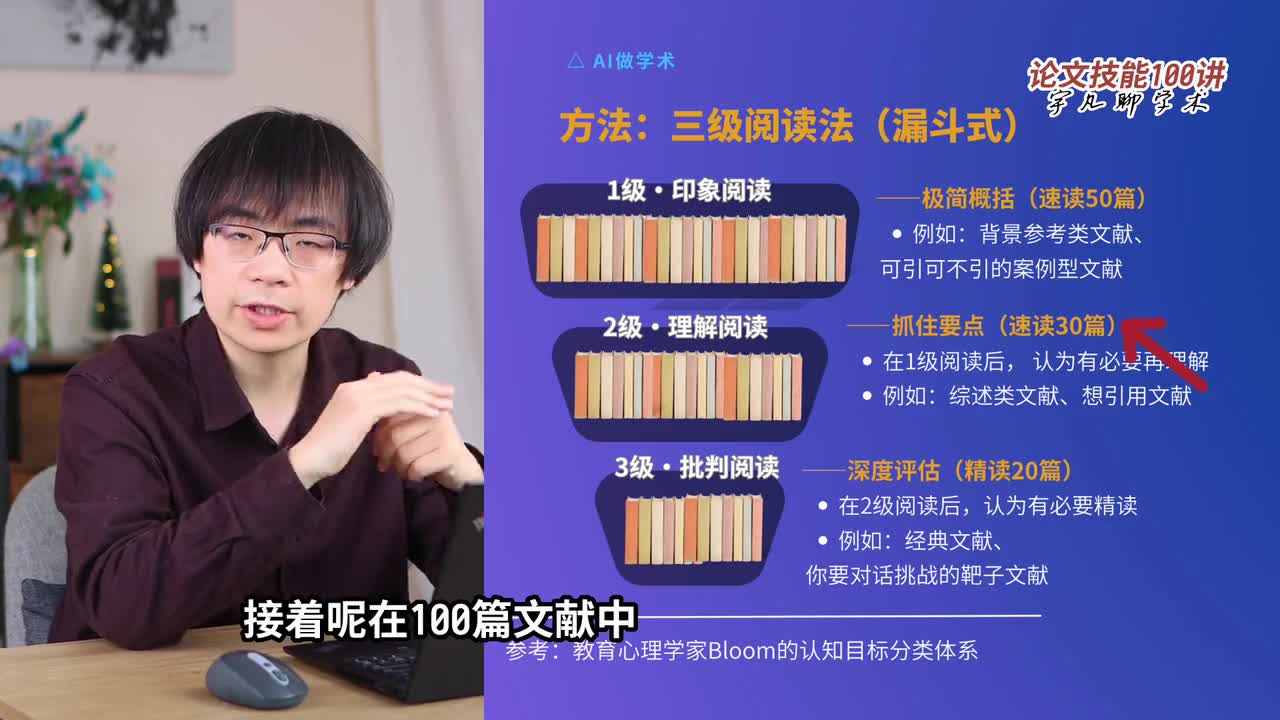 在一百篇文献中你不可能全部是精读,你也不可能全部是速读。你要有一个分类,一百篇中你要去速读的,只要有一个印象,你可能会有五十篇,这是第一级阅读。接着呢在一百篇。文献中大概会有三十篇,你同样是速度,但你需要到了第二级,就是理解阅读,因为你要来抓住它的要点啊。那么在一百篇中,最后还有二十篇你是需要精读它的,你需要去批判阅读,去深度评估。