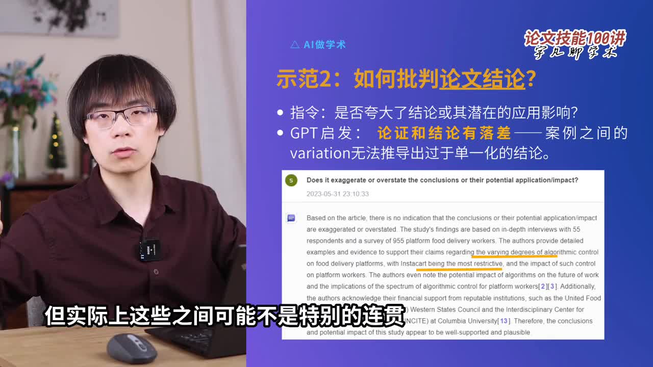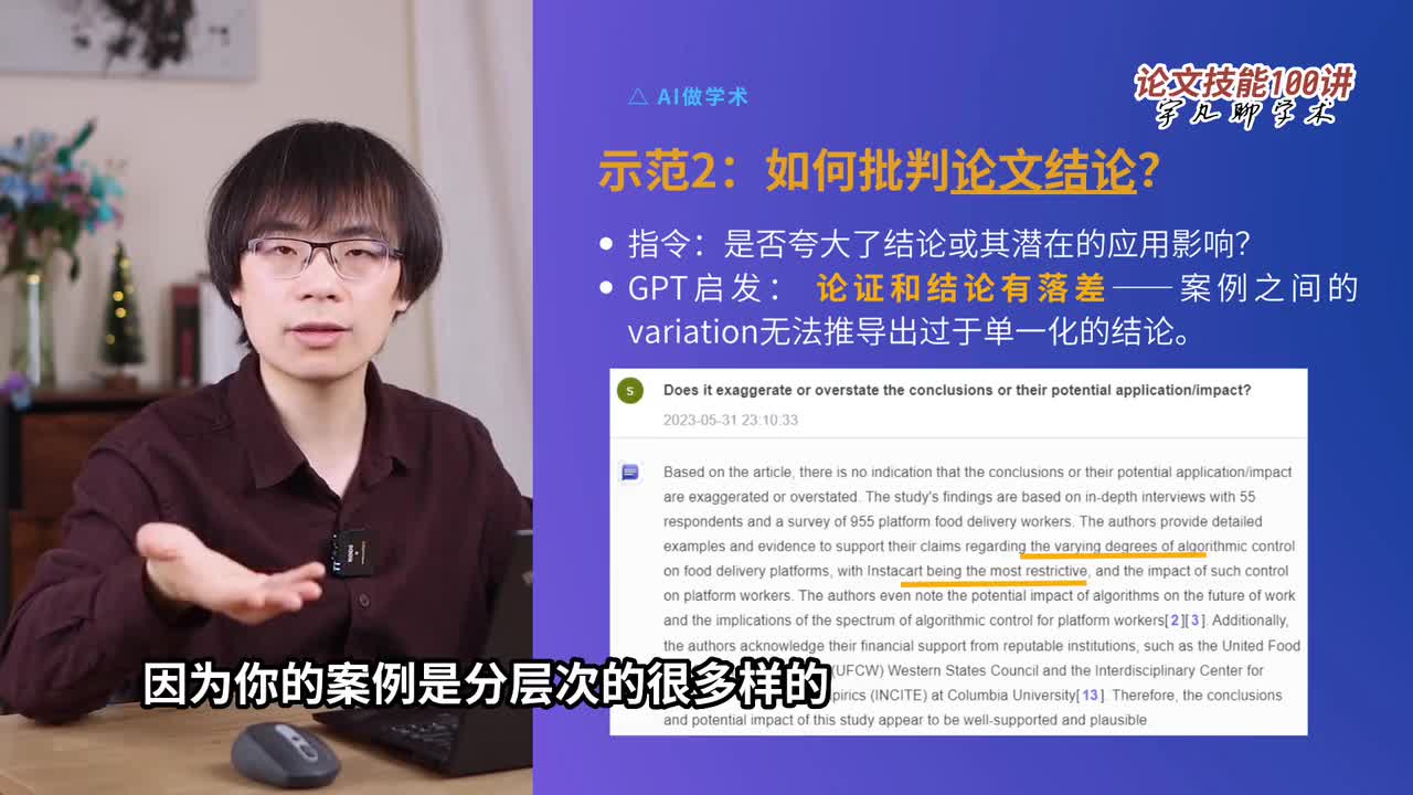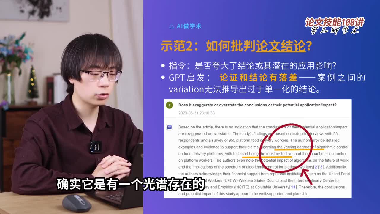 你会发现g p t给你的回答同样是非常有启发的。他同样告诉你说他访谈了这么五十多个人,就他会告诉你这个算法的控制因平台而异,哎,有的非常严格,有的不严格。确实它是有一个光谱存在的。所以当你去看了g p t这样一个回答就会给你带来启发。好像他的概念结论和他的案例多样性之间不是非常匹配,所以存在夸大的而疑议,你的批判性视角就出来了。