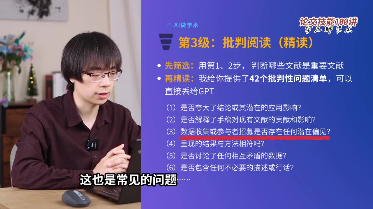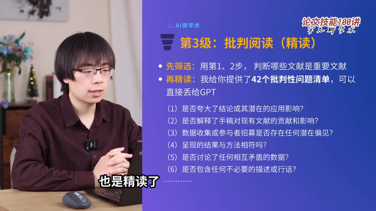 包括了这篇论文的各个方面,各个主题分成了三四层的结构。好,现在你的二级的阅读笔记就已经自动生成了。我们接下来呢就进入第三集的批判阅读,也是精读了。通过前两步你可以判断一篇论文是不是重要。哎,如果你觉得重要就需要再精读的话,究竟从什么角度来精读呢?我给你提供四十二个批判性问题清单,你可以把这些直接丢给g p t,我这里就不再展示给你了。