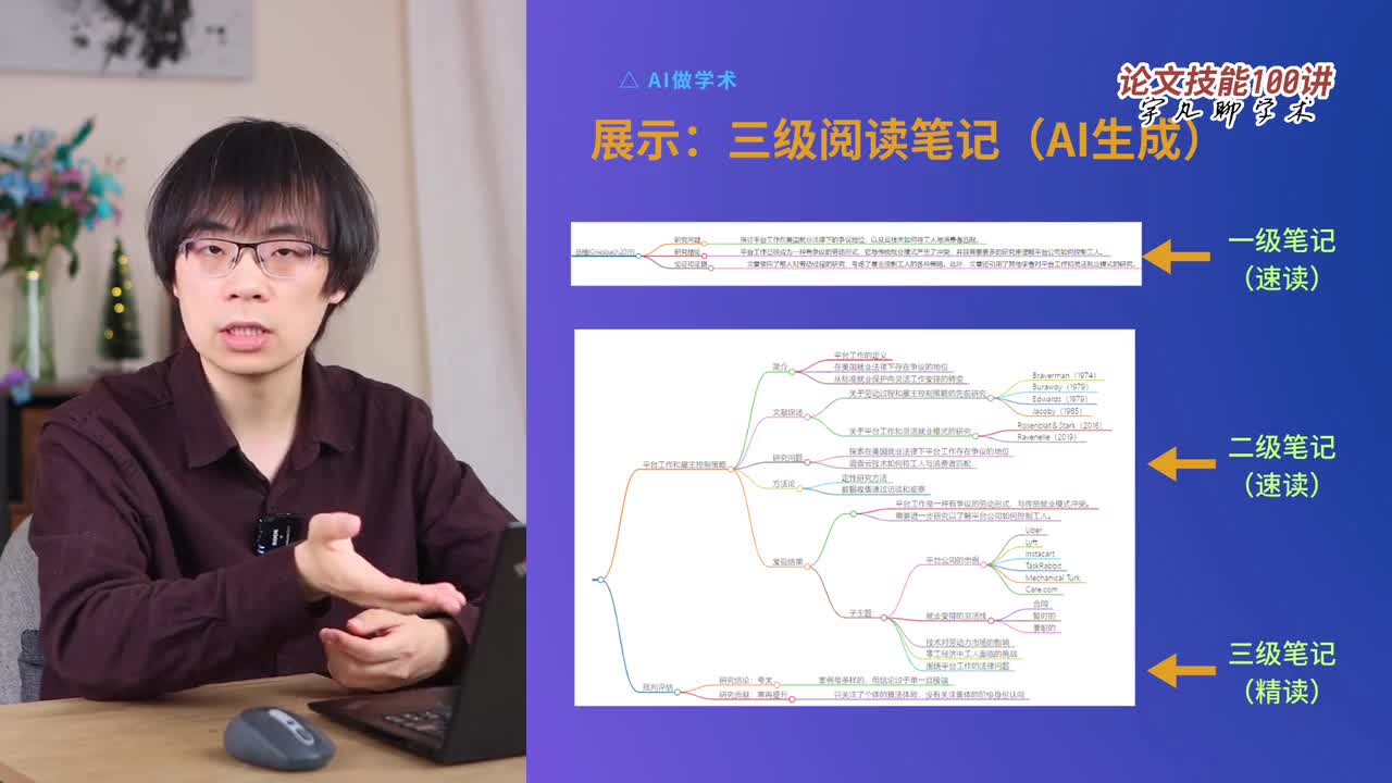 啊,第三级的批判阅读呢,你也可以做到这个思维导图里让他生成,我这里就不仔细展示了。最后不管是你在阅读文献的时候,还是说具体写论文,都会遇到很多很多问题。所以呢我也专门开了一些关于论文写作和学术技能的讲座。比方说如何。追踪国际前沿文献,哎,如何写文献综述啊,你在写论文的时候怎么用理论?怎么找理论框架啊,怎么理论对话啊,我其实啊从二零二零年以来都已经开过这方面的很多讲座了。