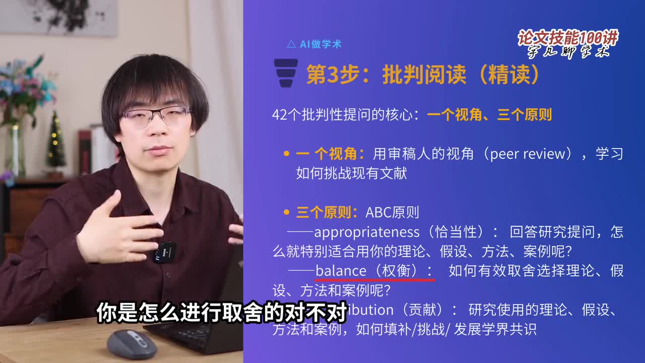 a就是appropriate,就是恰当性。你回答你的研究提问,怎么就觉得你的理论、你的假设、你的方法、你的案例就是最合适的呢?你得有充分的证明。接着b呢就是balance,就是肯定有很多理论、很多方法、很多案例,你是怎么进行取舍的,对不对?你要给一个论证的取舍过程。接着你会有c就是contribution,就是你研究你使用了这些理论、假设、方法、案例之后,哎,究竟你是怎么样填补啊挑战和发展,去出现现有的共识的。掌握这个a b c原则,你就知道怎么进行挑刺了。