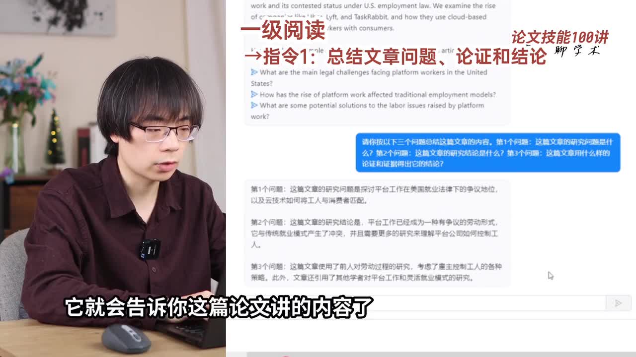 来了,接下来呢我就来操作演示给你看啊。现在我把这篇论文导入到chat p d f里,然后呢我对他提出了三个问题,让他总结这篇论文的问题是什么,结论是什么,以及他通过什么样的论证和证据得到他的结论。现在我点击发送g p t,正在生成他的答案,很快他就会告诉你这篇论文讲的内容了。生成之后,我让g p t继续按照markdown格式来重新写他的回答。在g p t把它的答案改写成markdown格式之后,我把它复制下来。