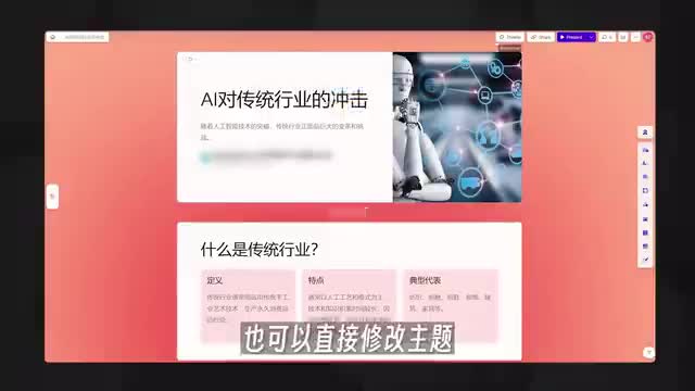 这个软件可以帮你快速生成精美的p p t。你需要给它一个主题,它会先帮你生成这个主题的大纲,然后根据大纲内容在三分钟之内生成非常精美的p p t。你可以随意修改生成的内容,也可以直接修改主题。点击右上角的播放按钮就可以预览画面了。个人感觉这个软件做出的p p t真的非常简洁,看起来也很舒服。