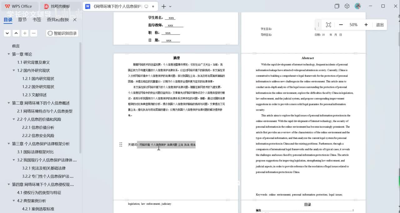 然后摘要它摘要对通篇进行的一个简单的概况啊,写的还是不错的。然后关键词网络环境,然后个人信息保护法。网络环境这一块是目前来说是安全问题最大的,所以说它放出来的首位对吧?然后目录。