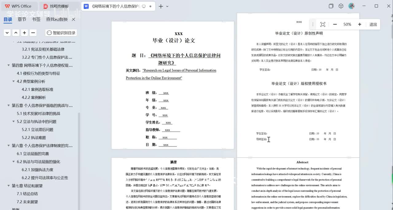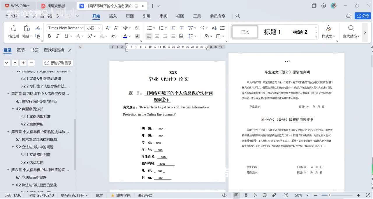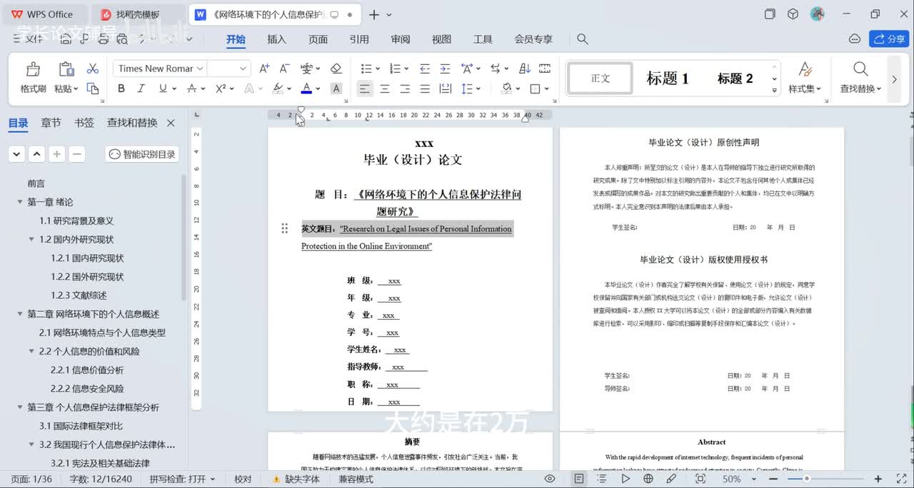 然后我们下载下来看一下。这个就是我们生成的一个初稿,大约是在两万一万六千字符吧,基本上本科论文的话是够了。我们看一下它的框架,这是封面,然后原创声明这些都可以进行修改的。