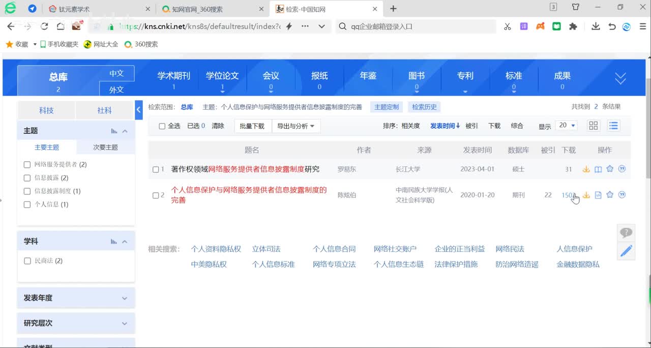 然后我们搜一下这个文献好不好?个人网络安全法。好,是不是这个人,而且他的数据还有一个什么什么什么优点啊?看这里了吗?这个地方下载量一千五百零二代表着什么?它一千五百零二它只有三十一,为什么呀?年限上是有区别,它也它是二零二零年,它是二零二三年的这这是一方面哈,但你不要管这个时间。背影二十二次下载一千多次,说明他的这个参考文文件是价值的。