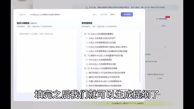 选择完字数后,这里还有一个比较重要的地方。以文学类的论文为例,在这里填入跟我们论文相关的作者、人物关系、作品简要等介绍,能让我们生成的论文更精准。填完之后,我们就可以生成提纲了,提纲是可以不限次数生成的,不满意可以重新生成,左边可以自定义编辑提纲,如果自己有提纲的话,可以编辑上去,这样就会按照我们自己的提纲生成论文。