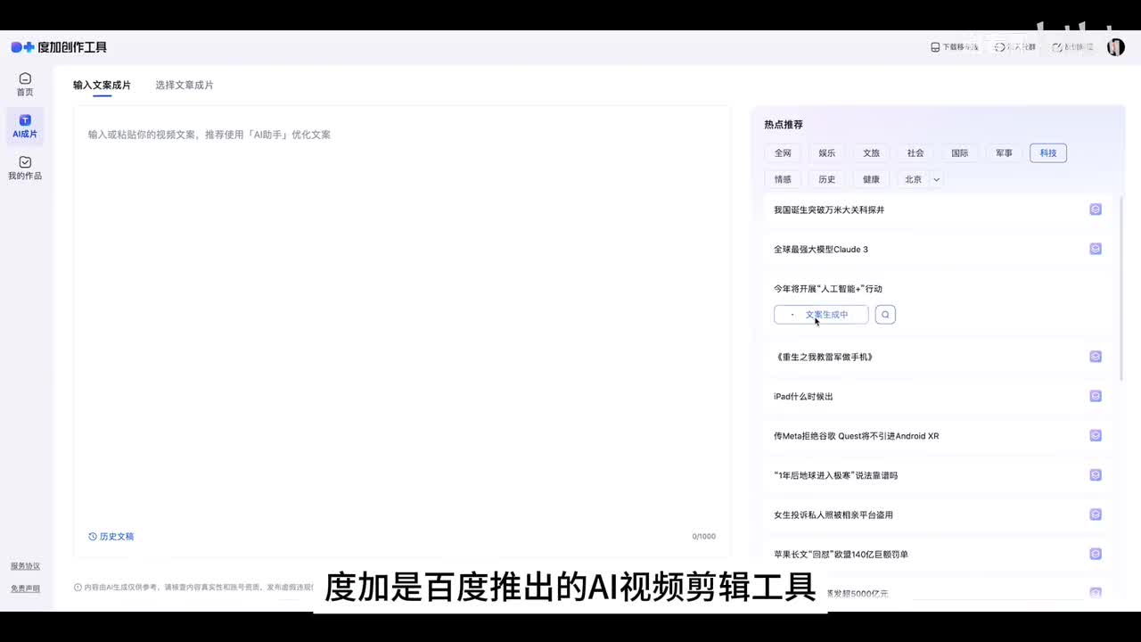 如果你不知道分解出来的某一步具体该怎么做,那就再点一下,它会继续为你生成更细的任务计划,从此你不需要再思考某项任务该如何完成,只需要按顺序执行它为你分解出来的动作即可。第六名,杜佳。杜家是百度推出的ai视频剪辑工具,sara还没有开放gk a和runway,只能生成几秒钟的视频。虽然它们的质量和自由度更高,但需要频繁的修改提示词,并把无数个几秒钟的短片拼接成一个完整的视频,这依然是一个工作量很大的事。