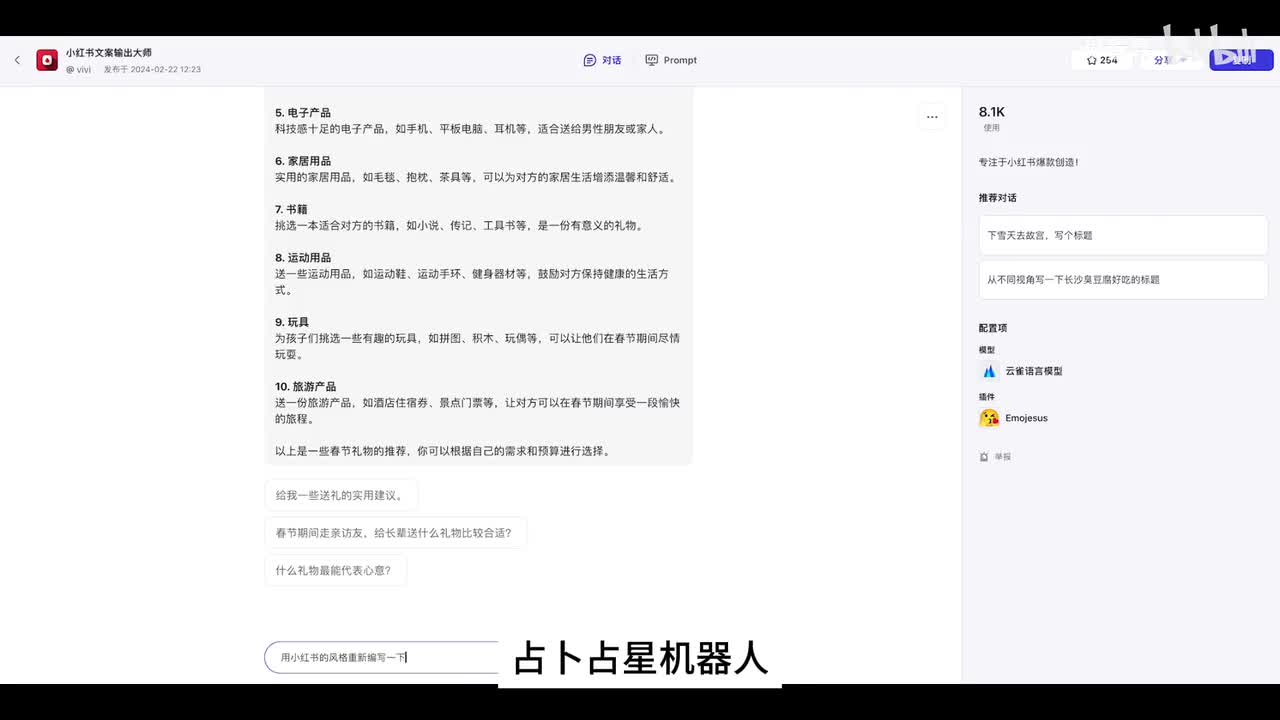 例如写一个刚刚他他来帮你写完整篇文章。打开一篇文章让他来帮你改编译器以及提升文案软件,或帮你翻译成其他任何语言。打开一篇文章让他为你总结全文,甚至对几十上百篇文章开启一键总结。你还可以自定义prompt,让他按一定的规则为你取标题,将文案改成小红书风格,甚至出二十个相关的标签等等。
