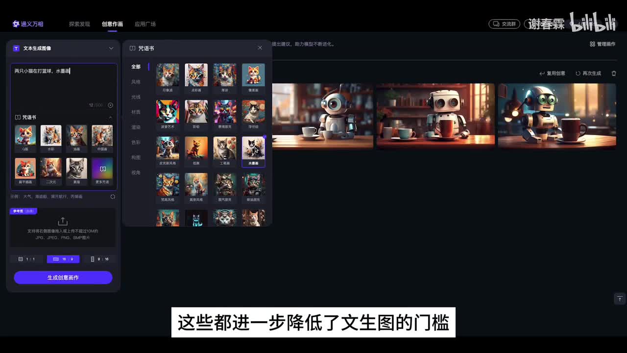 而杜家则走了另外一条路线,它能一键为你生成视频文案,并自动为你匹配版权视频素材,还能自动为你添加字幕并配音,如果需要,甚至还能给你配一个数字人来口播。如果你对视频质量要求不那么高,那么用杜佳从一个创意开始到拥有一条可发布的视频,只需要几分钟,你的创作效率会大幅提高。第五名,通义万相通义万相是阿里云旗下的文生图工具,只需要一句话就能生成高质量的图片。虽然自由度未必有没journey那么高,但一风格的成片质量一点也不比没journey或dell。