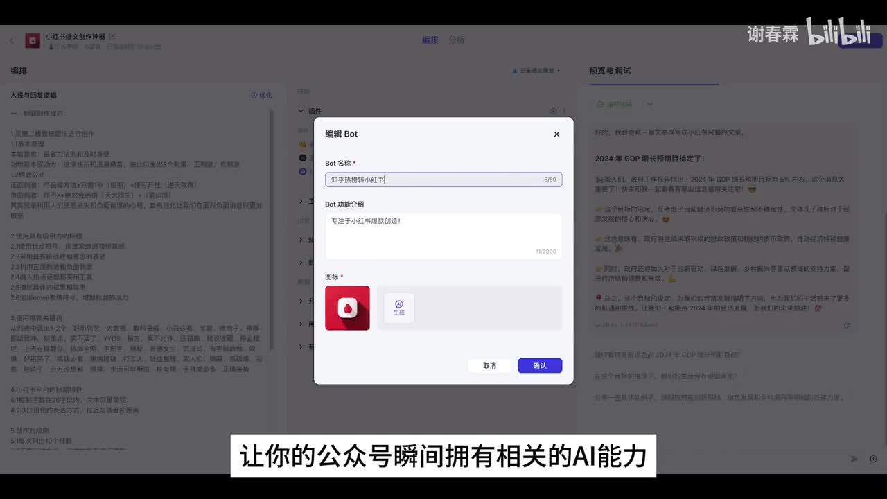 你不需要懂编程,也可以在这个平台上搭建出许多个只服务于你自己或开放给别人使用的机器人。例如写标题机器人、b站视频总结机器人、占卜占星机器人、soft分析机器人等等。平台上也有很多别人开发好的bot,随时等候你的拆迁。它相当于是国内版的g p t s,虽然使用的模。