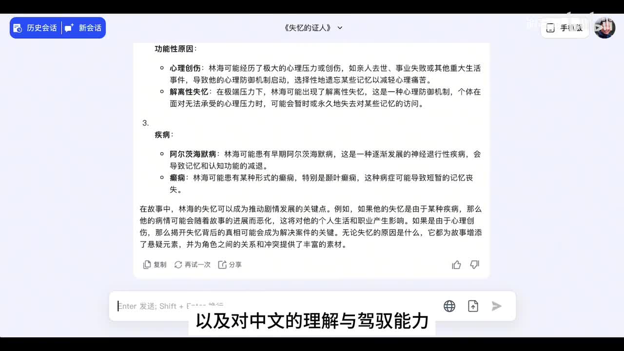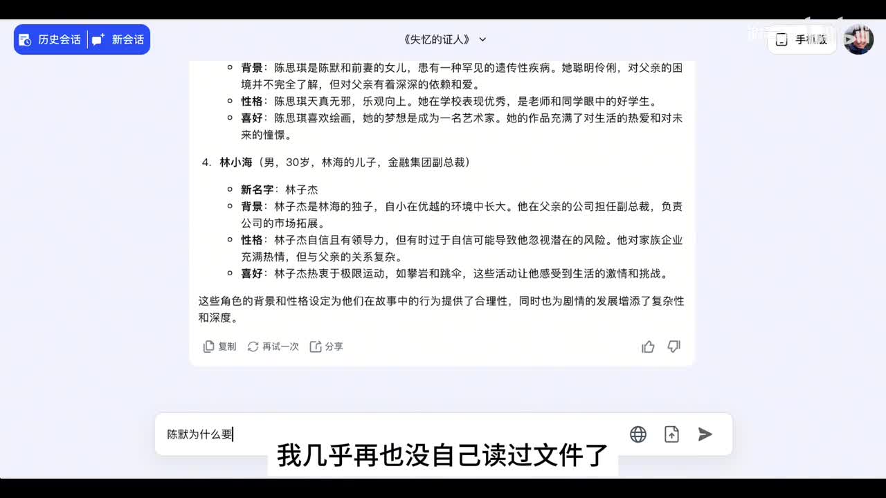 例如,直接把word p d f、excel p p t等文件,甚至一整本电子书丢给他,让他帮你总结二十万字的长度,几乎很少有文件能难倒他。如果有遇到不理解、不清楚的地方,直接问他就行。有了它,我几乎再也没自己读过文件了,只有想确认某些细节时,才会打开原文件来核对,因为能处理的文本更长了,所以它有更强的上下文记忆能力。我试着用它来创作小说,在推演了几十遍剧情之后,他依然记得某个最初的设定,让我震惊不已。