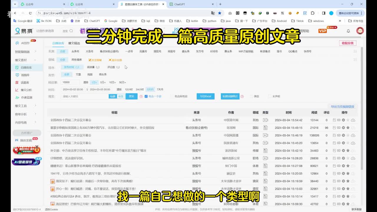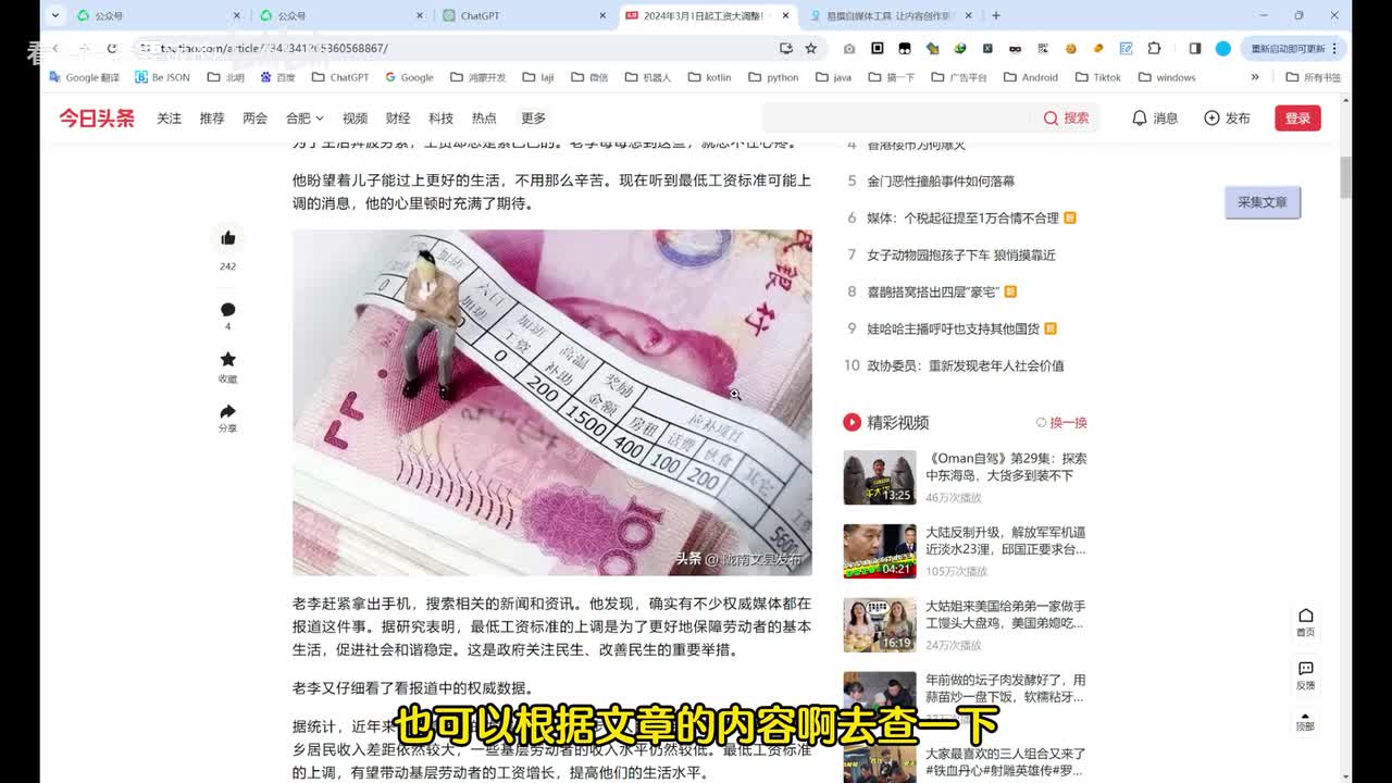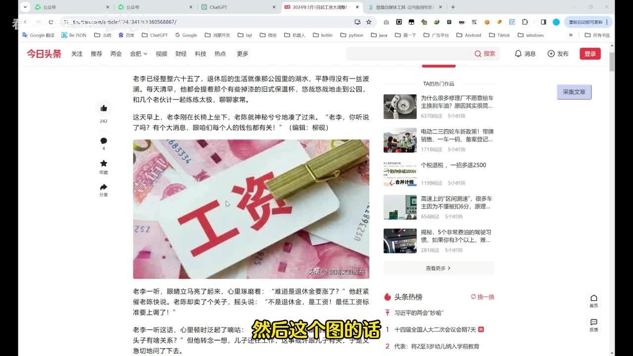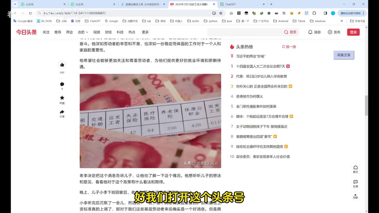 然后找一下阅读量大于一万的职场类的。找一个头条号吧。好,我们打开这个头条号。然后呢,我们这个小插件,这个插件。然后采集文章啊,这里已经采集好了。