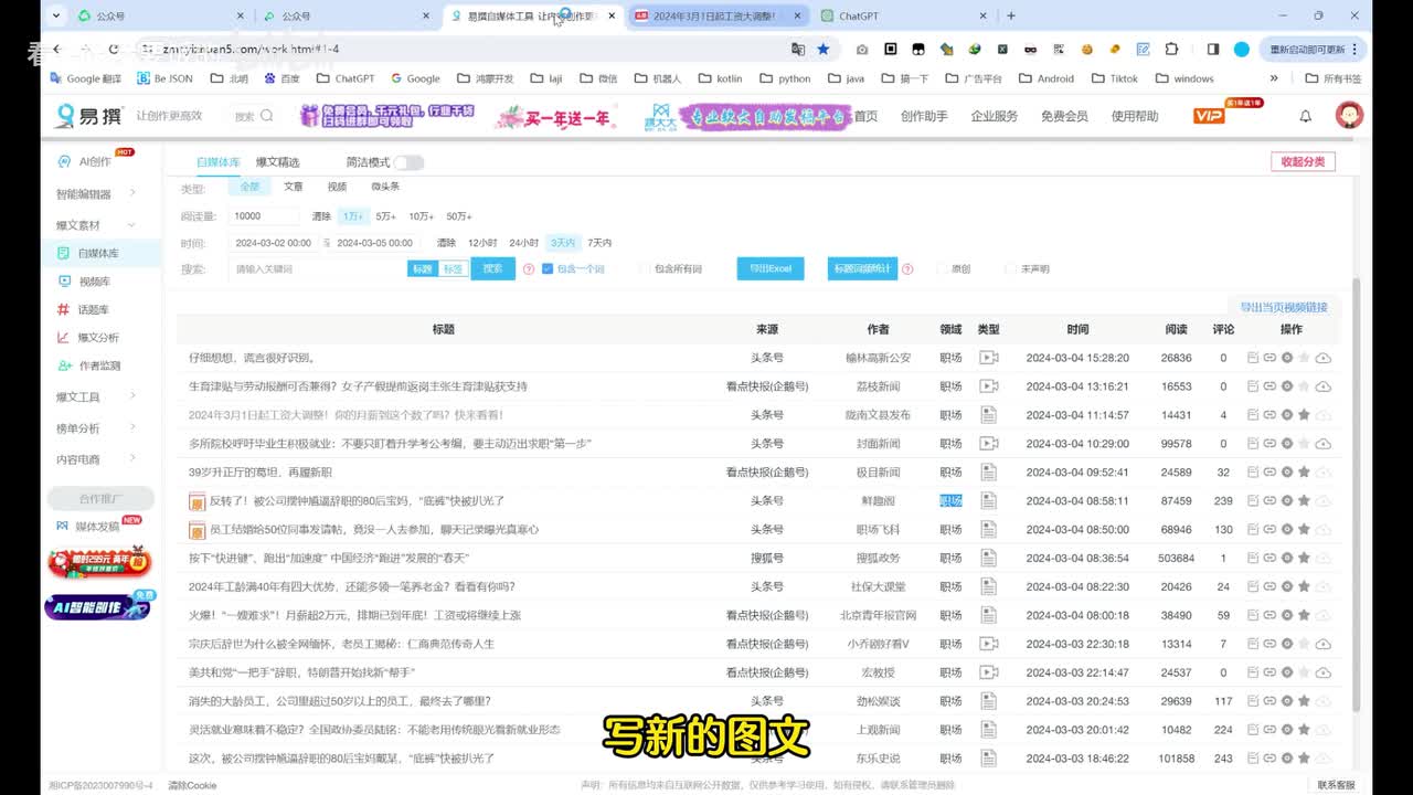 给大家推荐一个这个公众号公众号的新玩法。呃,a r也能玩吧。我们现在呢先找一篇在易传上面啊,找一篇自己想做的一个类型啊,筛选一下类型。找一个我这个账号是做那个职场类的,搜一下职场。职场,这里我们点一下。
