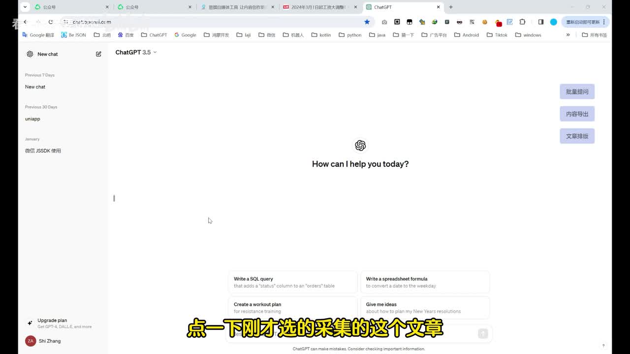 点一下,只需要点一下这个采集文章就行了。然后我们回到这个chat g p t。回到chat b g p t之后呢,点击批量提问。点一下刚才选的采集的这个文章,然后上面的这个。浓缩浓缩的内容指令啊,这都可以改啊,这指令都可以改啊,我这我就使用默认的给大家演示一下。