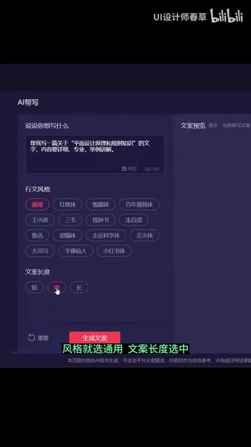 比如我输入这段话,风格精选通用文案长度选中点生成文案,等待几秒a i就给我们写好了。