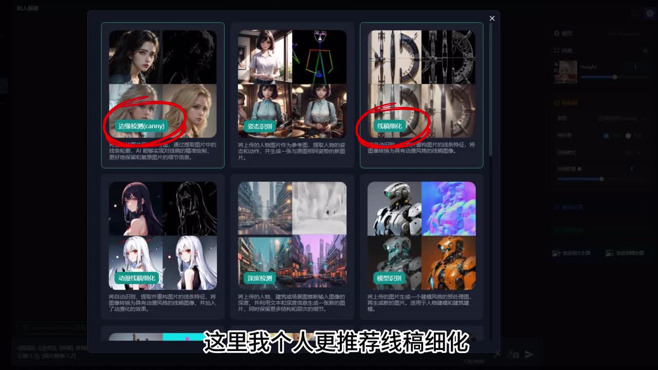 选完laura后再选择下控制网类型,边缘检测线稿细化超清重绘都可以。这里我个人更推荐线稿细化预处理,选yes控制模式,选出图更遵循预处理图,控制权重设置为一或一以上。