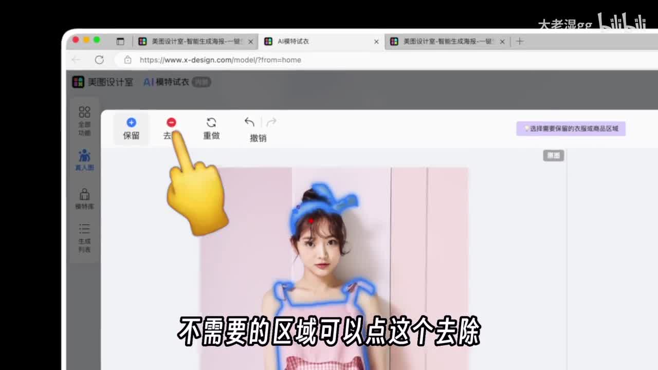 然后我们回到a i模特试衣上传图片,选择要保留服装的区域,不需要的区域可以点这个去除。在这里我们看到保留的区域没问题后,点下一步就可以直接选择模特了。