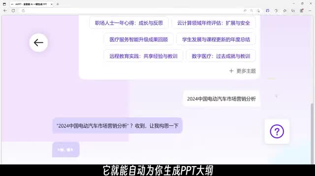 只需要在这里输入想要制作的p p t主题,它就能自动为你生成p p t大纲,非常的全面,你可以在此基础上进行内容调整。