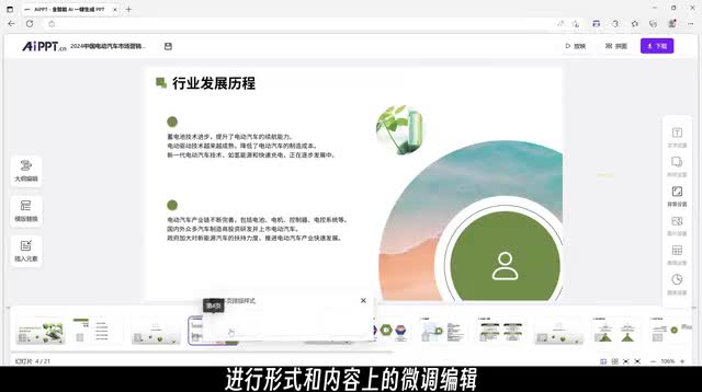 你可以根据需要对生成的p p t进行形式和内容上的微调编辑,然后导出为p p t文件,一个p p t的制作就完成了。