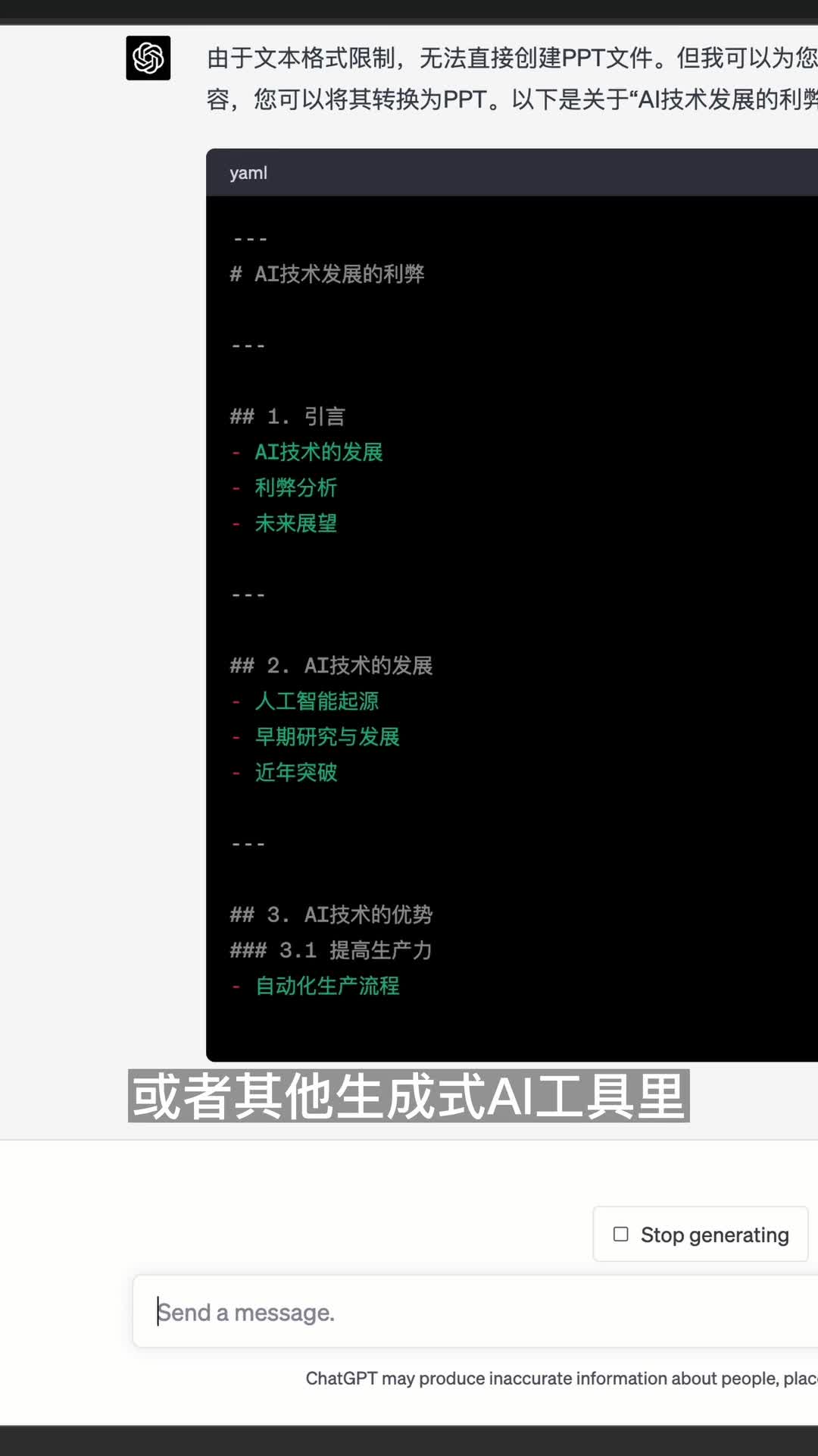 第三,mitchell首先在拆g p t或者其他生成式a i工具里,以k t i g格式生成高质量的p p t内容。